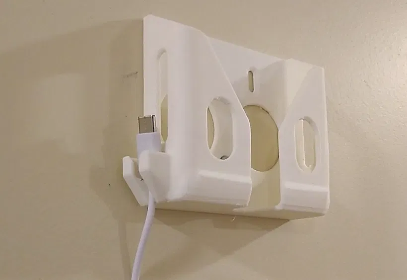 Bắt đầu từ hình dáng phone-holder đơn giản của Tazik, mình đơn giản hóa mesh lại một chút, rồi bo/vát cạnh (chamfer) để in ra nhìn gọn và sạch. Mình tăng độ sâu lòng trong, làm mỏng thành khá nhiều, và khoét thêm nhiều cutout để giảm vật liệu mà vẫn in ổn (giờ dưới 50g). Ngoài ra mình thêm lỗ bắt vít treo tường để có thể xoay chỉnh nhẹ cho lên thẳng, rồi gắn thêm một cái kẹp/giữ dây ở bên hông, tương thích đa số dây USB-C để lúc nào cũng có sẵn dây sạc khi đặt điện thoại lên giá.