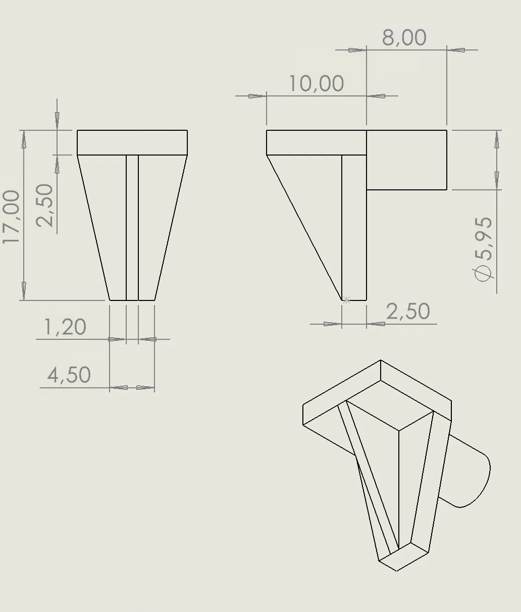 Chốt/giá đỡ kệ tủ (cabinet shelf carrier) cho lỗ khoan ∅6mm. Thiết kế dày hơn 1mm và dài hơn chút so với bản gốc. Gợi ý in: 0.12mm layer, 3 walls, 25% gyroid, in chậm, không cần support.