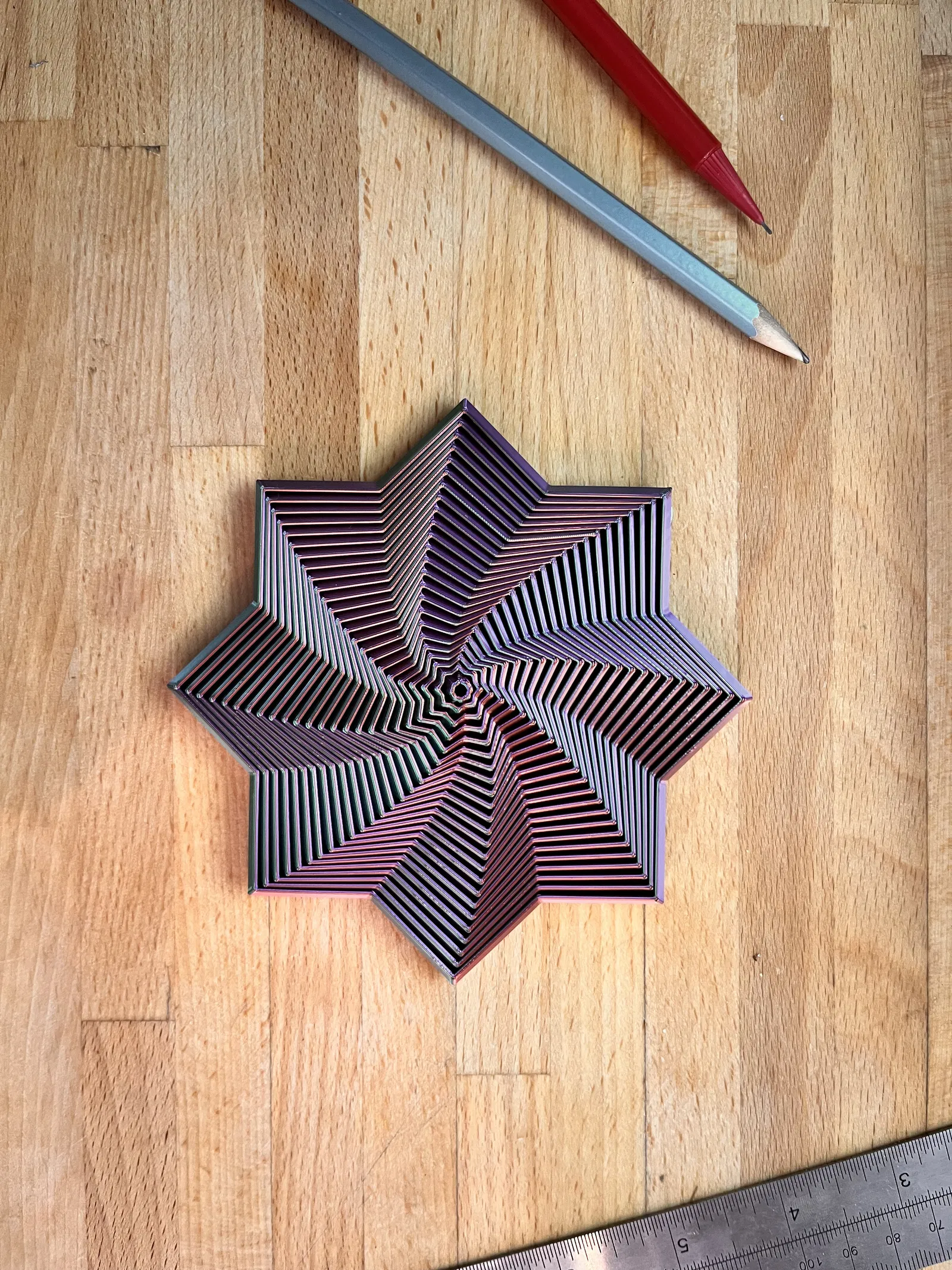 Khi cầm trên tay, cảm giác xoay vặn, lật qua lật lại của ngôi sao fractal này sẽ mang lại sự thư giãn tuyệt vời. Nó không chỉ là một món đồ chơi fidget giúp giảm stress hiệu quả mà còn là một vật trang trí độc đáo cho bàn làm việc hay không gian sống của anh em. Cái đẹp của nó nằm ở sự đối xứng, các đường nét hình học tinh tế và hiệu ứng chiều sâu ảo diệu mà các tầng fractal tạo ra.