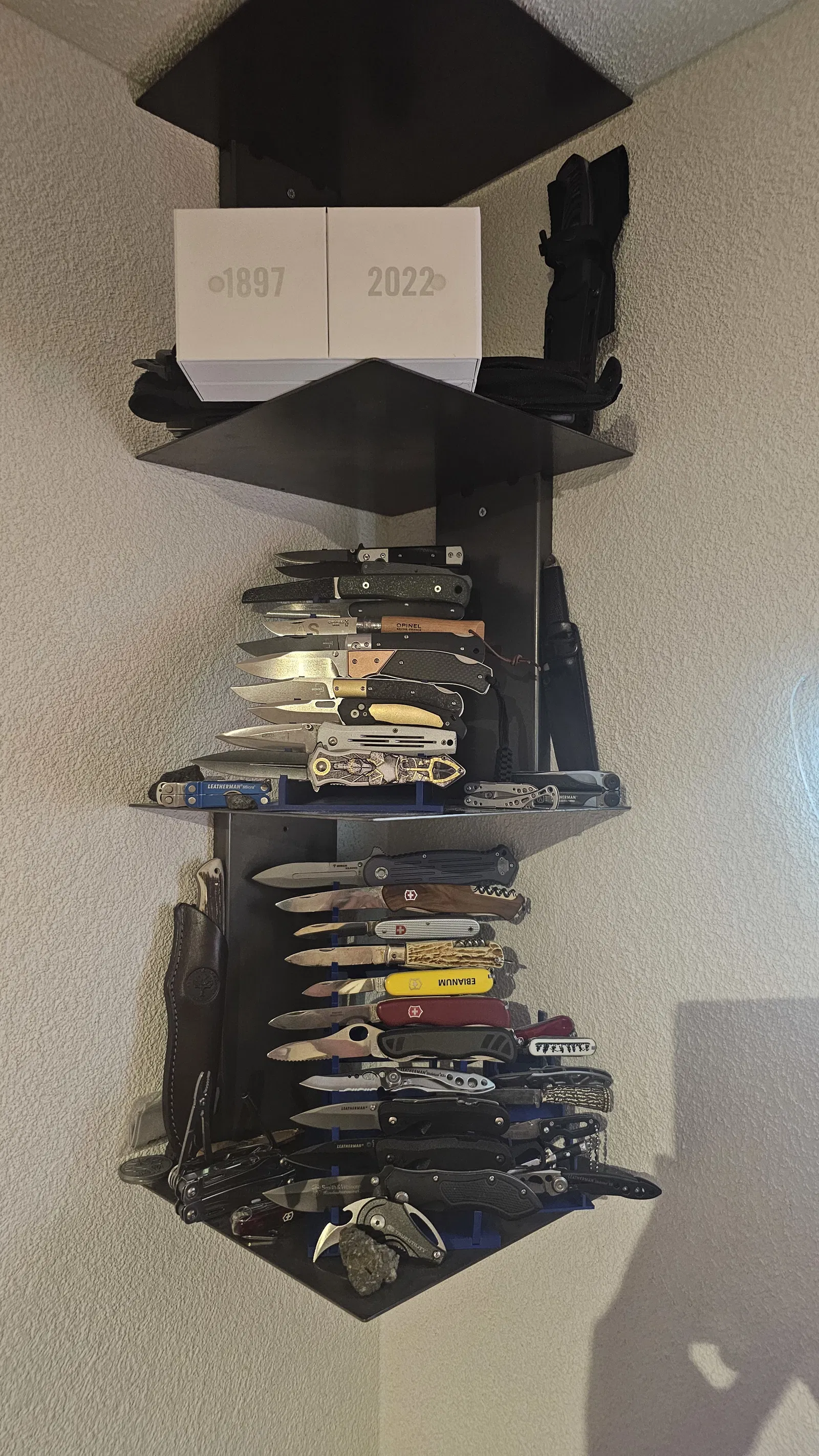 Trưng bày được 11 cây dao đủ loại. Bạn có thể scale xuống 50% nếu dùng dao nhỏ. Bản single kit cần mặt bàn in tối thiểu 240mm (chạy được với MK3s+), còn bản OnePiece cần chiều cao tối thiểu 240mm (đã test với Voron 2.4 300mm).