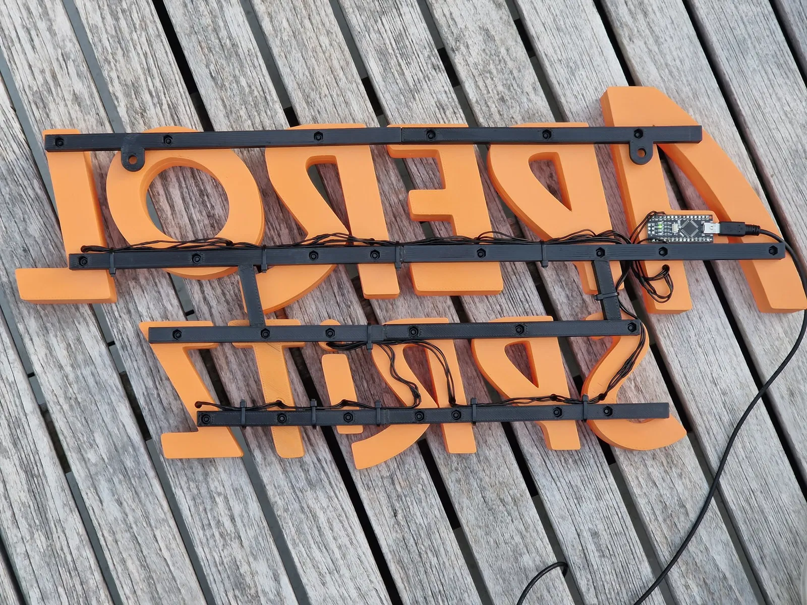 In tất cả các chữ cái riêng biệt (phần trên và phần dưới), bằng PLA màu cam. Các chữ cái có thể được vặn vào bảng phía sau bằng vít M3. Tôi đã chia các que thành hai phần và in chúng theo cách đó vì tôi không có máy in lớn hơn. Các chữ cái và que được dán lại với nhau bằng keo siêu dính. Có 70 neopixels trong các chữ cái chiếu sáng ra ngoài qua các lỗ, được điều khiển bởi một Arduino nano (xem hình).