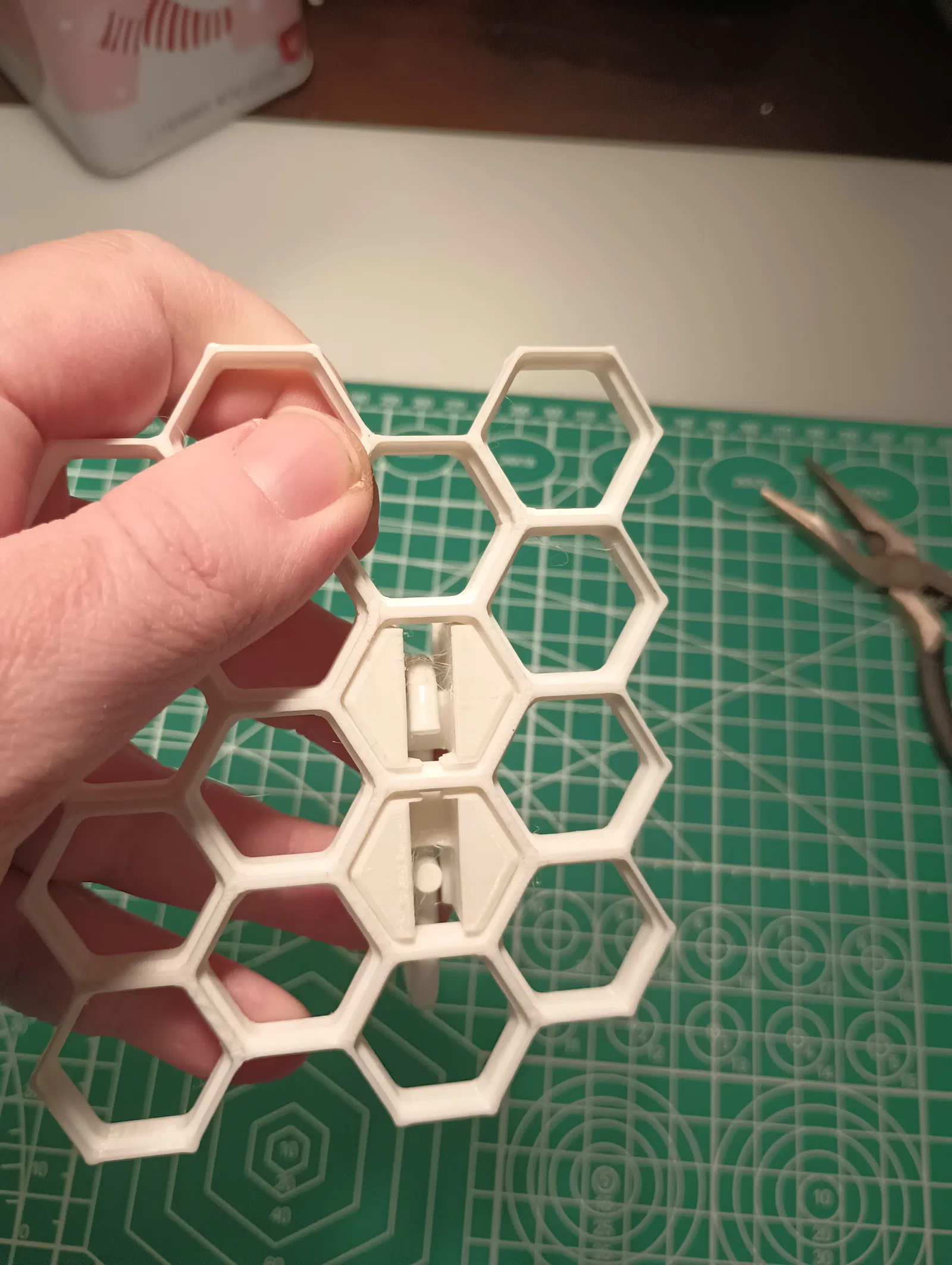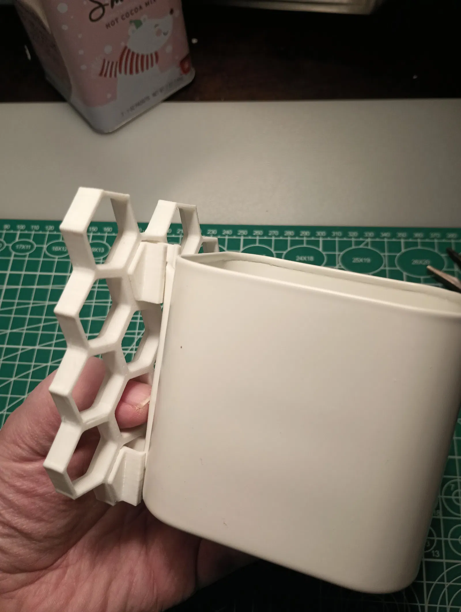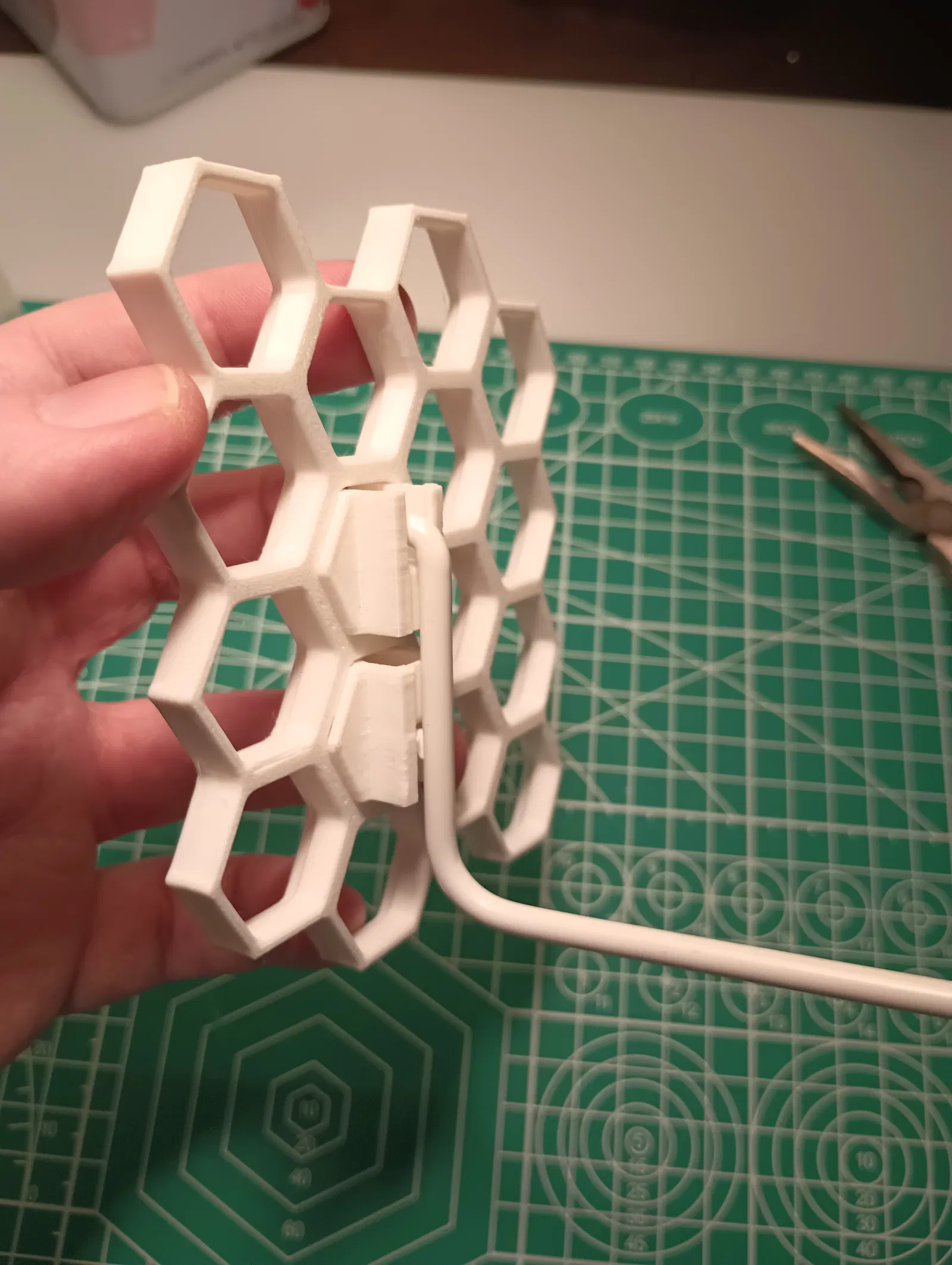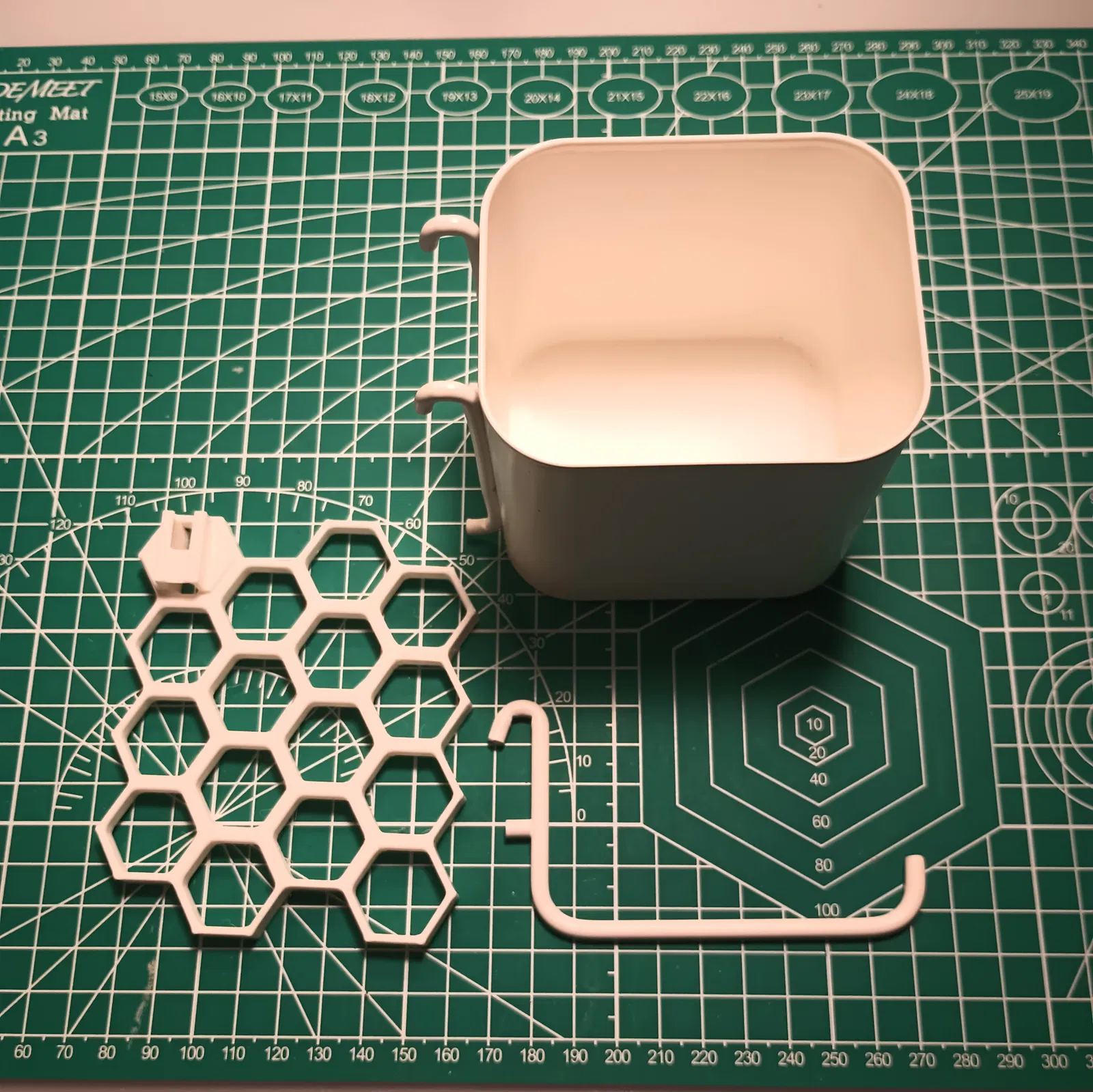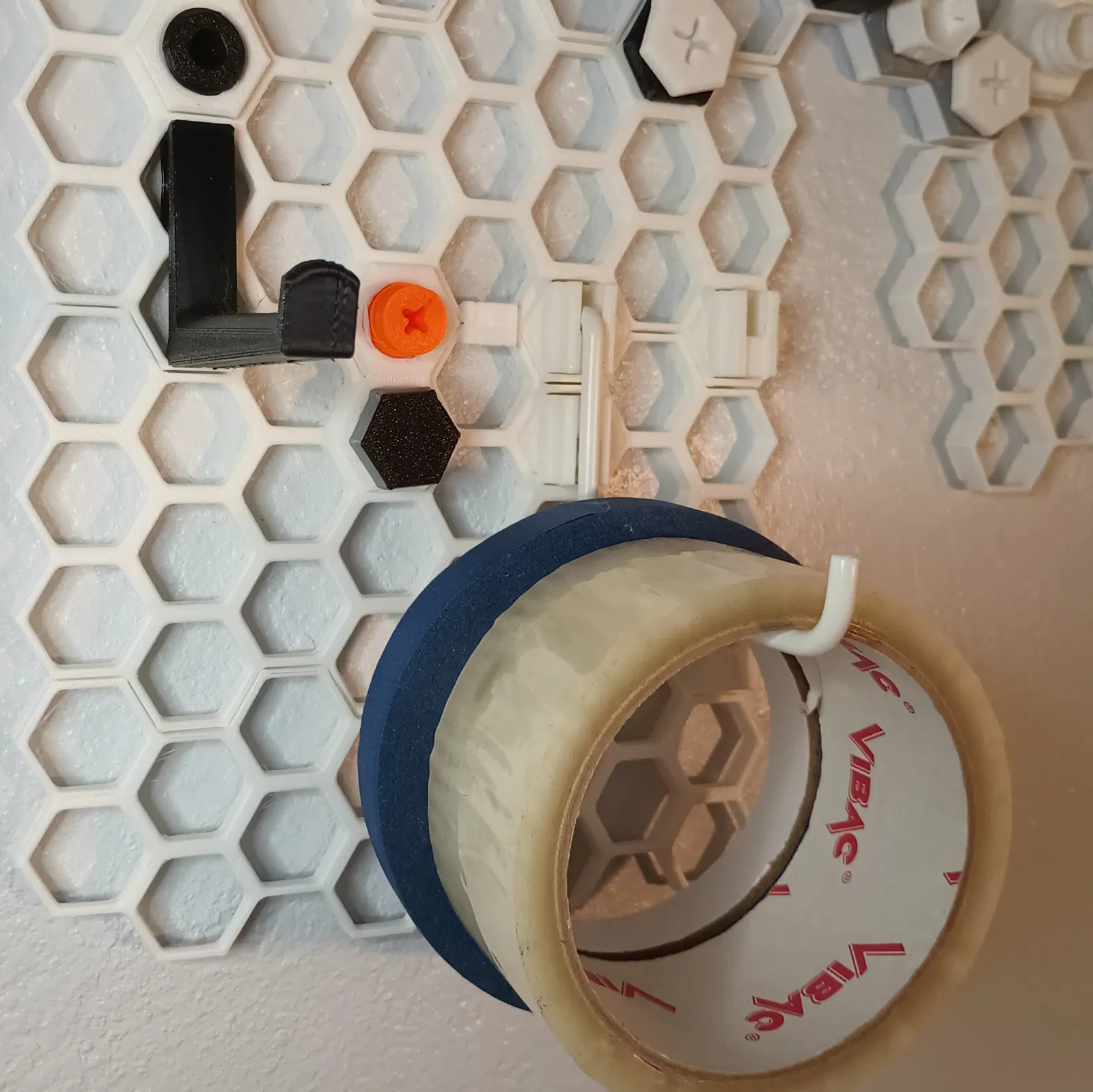 Ngàm/attachment của KYZ Design cho kết nối với tường rất chắc, nhưng vẫn tháo ra và dời vị trí dễ dàng. Model được tạo hình theo nửa dưới của lỗ treo (peghole) chuẩn Skadis, và canh vị trí để cái móc phía sau Skadis nằm gọn trong thành của ô lục giác.