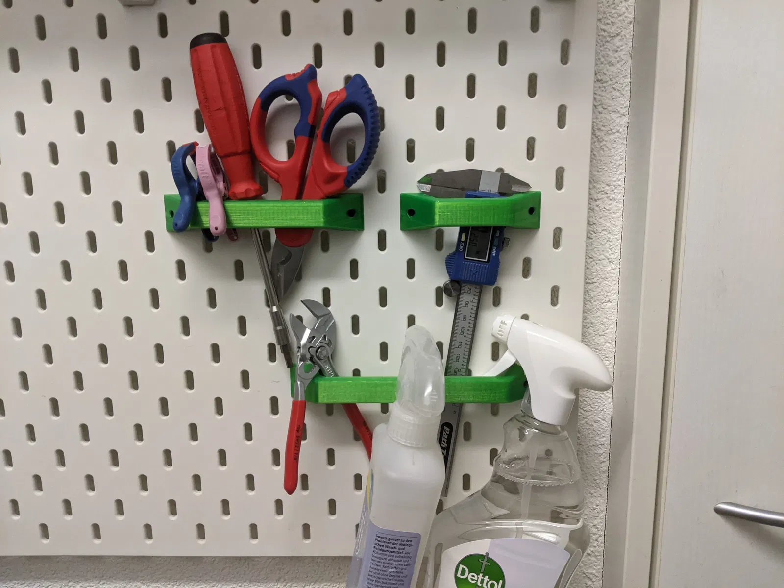 - Đưa cả cụm qua các lỗ trên pegboard Skadis theo cấu hình bạn muốn. Part sẽ tự canh thẳng.