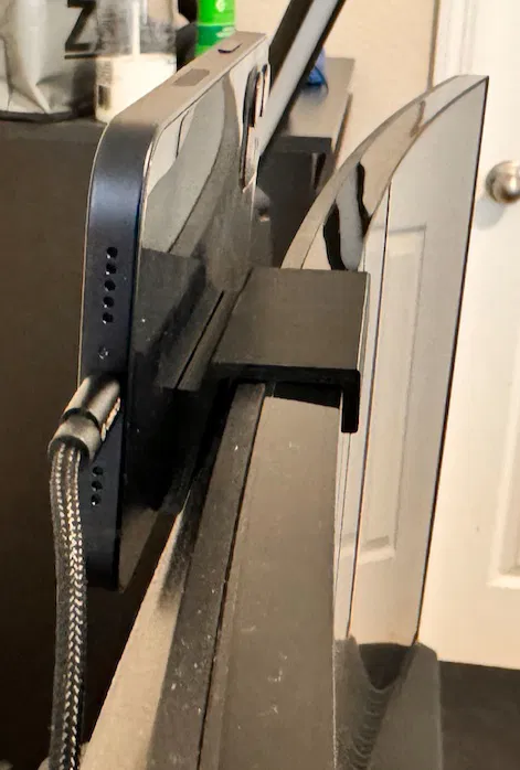 Giá đỡ để gắn iPhone lên màn hình LG 34WN80C-B UltraWide Curved, dùng iPhone làm Continuity Camera khi gọi video. Có 2 phiên bản cho iPhone thường và Pro Max; in dọc, không cần support.