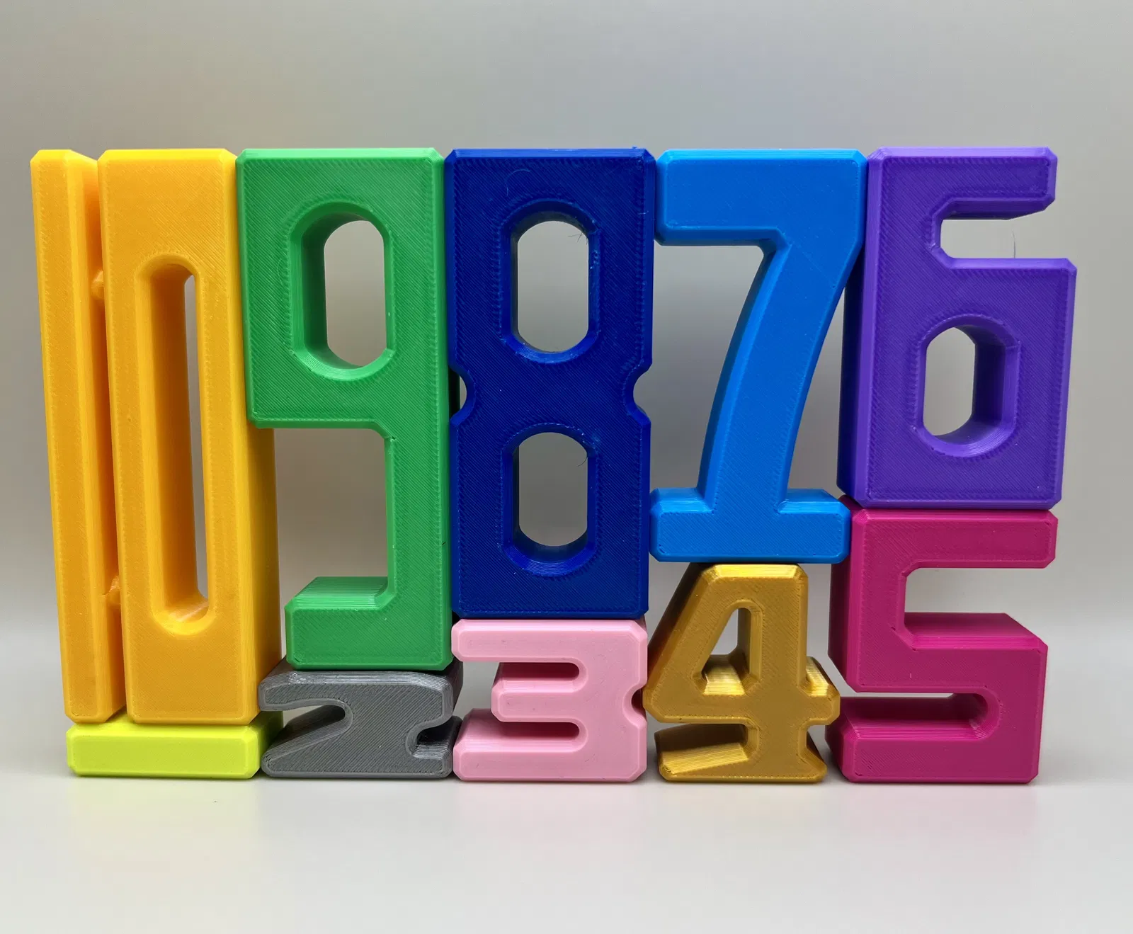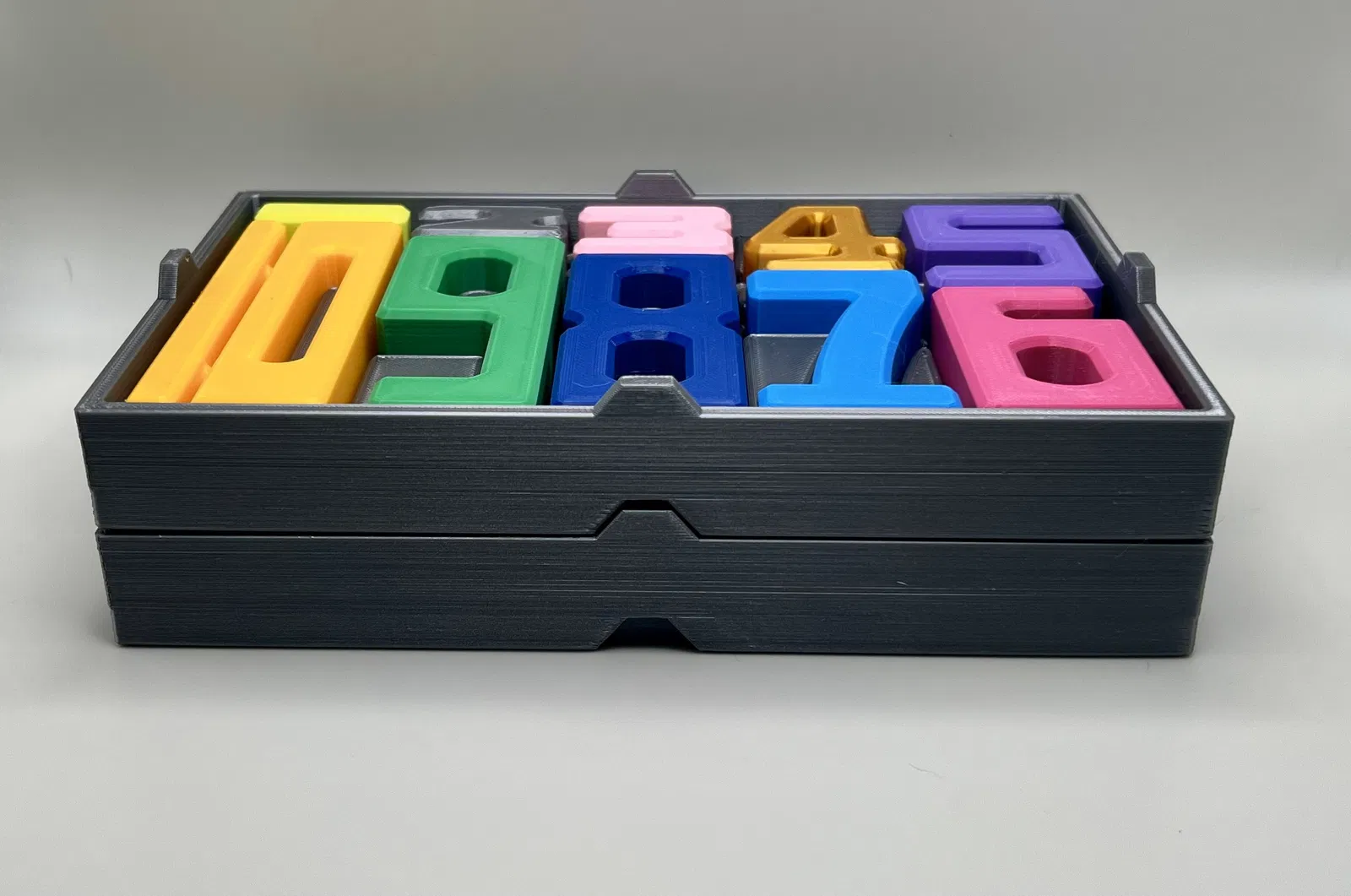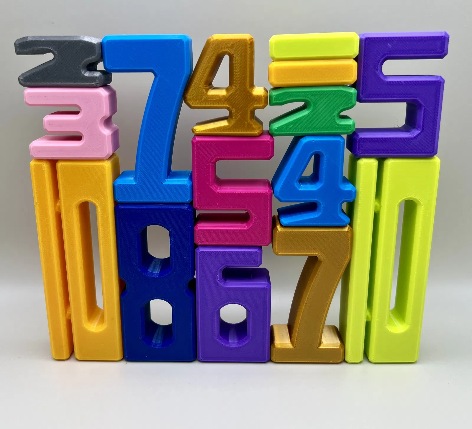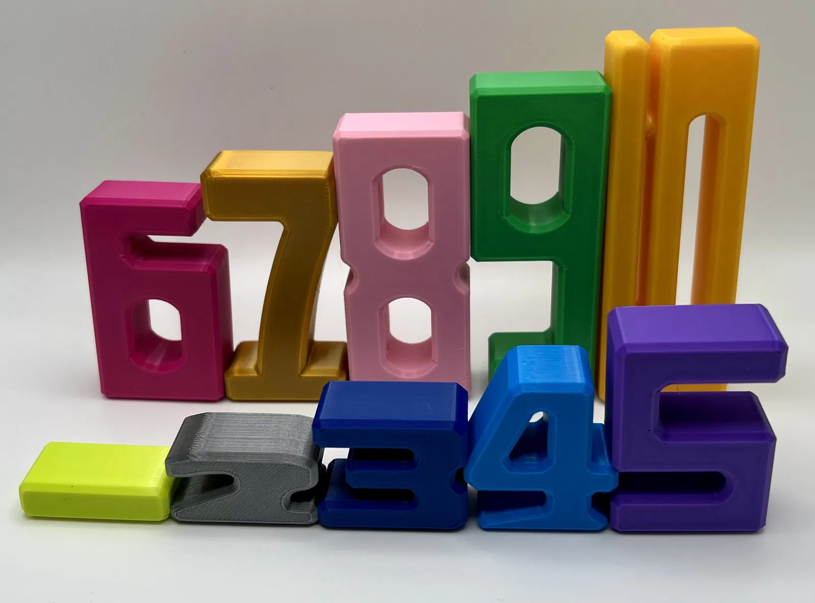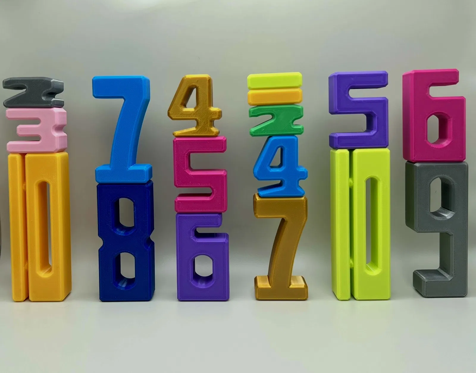 Bộ khối số 1–10 có kích thước tỉ lệ để học đếm, nhận biết số, giá trị số và luyện phép cộng/trừ. Khi xếp chồng, các tổ hợp có cùng tổng sẽ cho chiều cao bằng nhau. Kèm hộp lưu trữ (có/không ăn khớp) và file STEP.