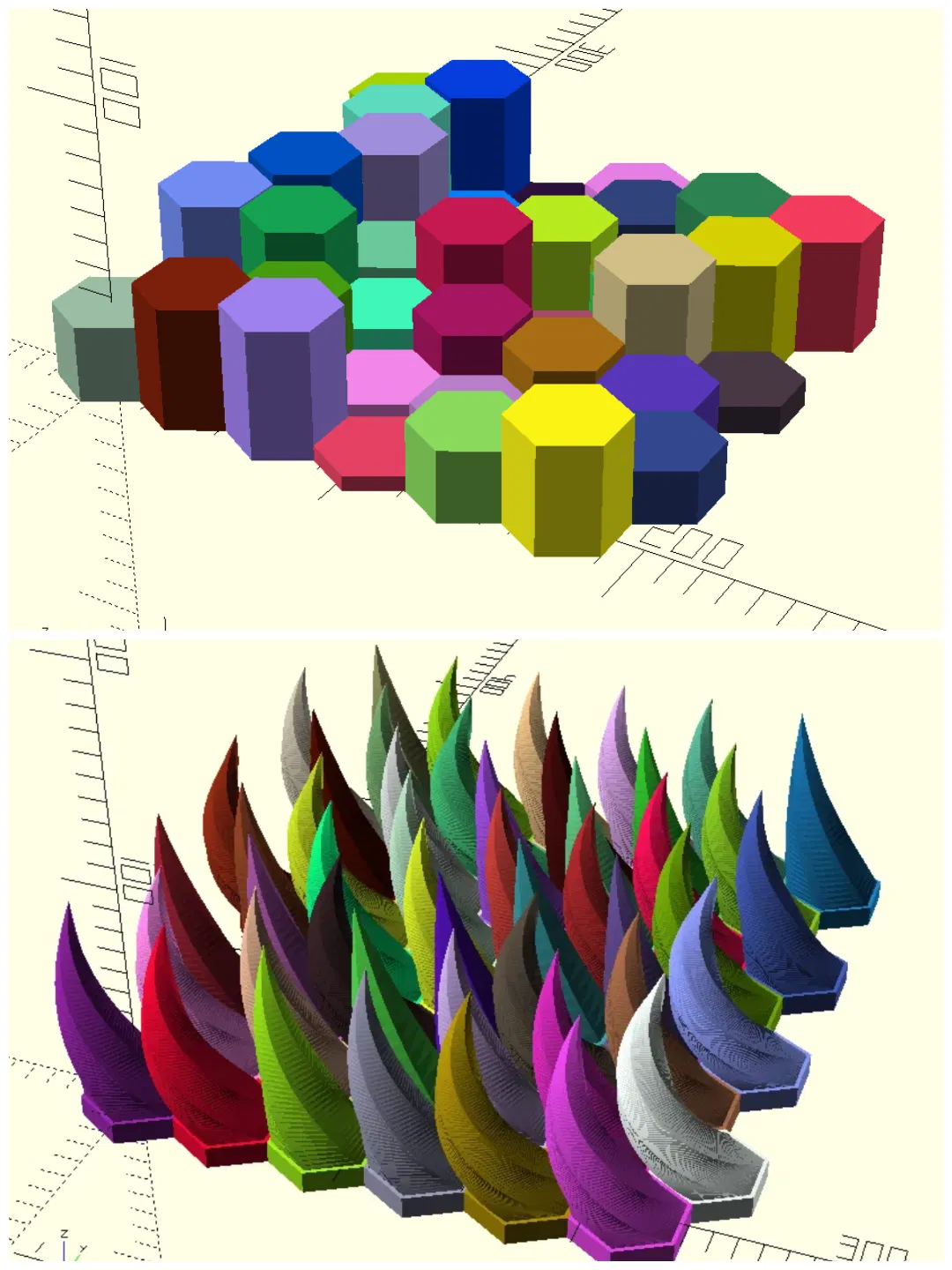 Mẫu wall art dạng parametric làm bằng OpenSCAD, phát triển từ thử nghiệm Fusion 360 và lấy cảm hứng từ tác phẩm của Herschel Shapiro. Có file hexagon random height, đang tinh chỉnh tham số độ xoắn và thử nghiệm mating interface.