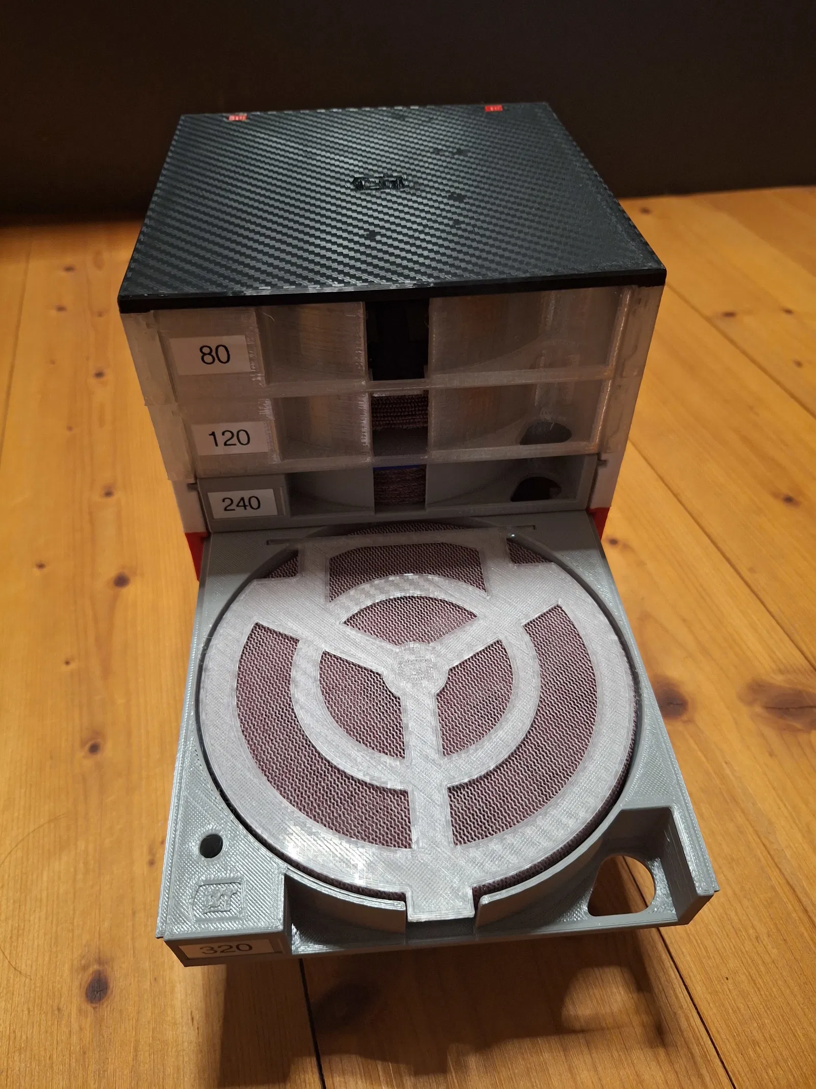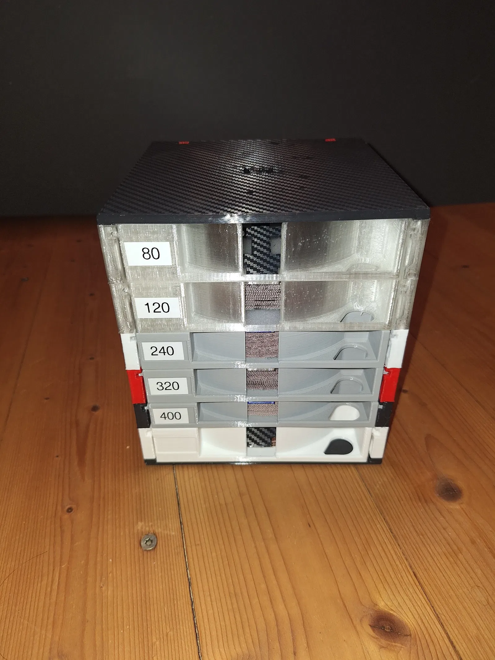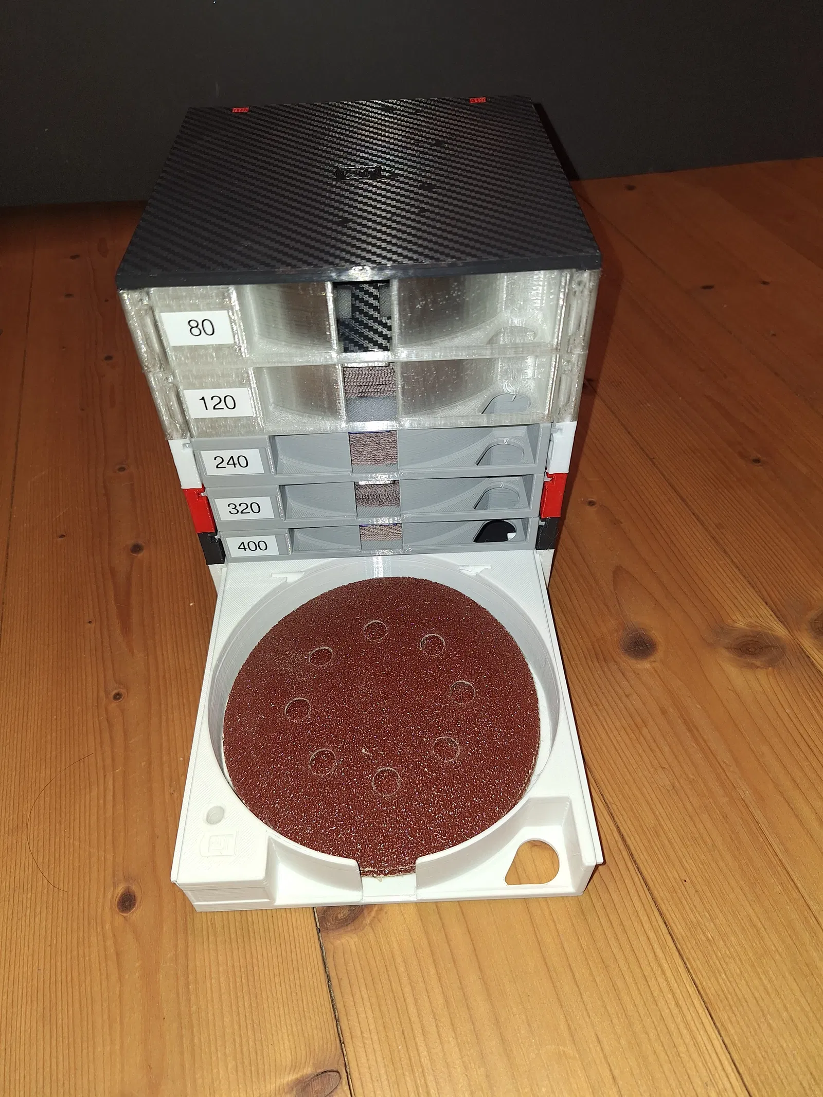 Dieser stapelbare Schleifscheibenhalter verfügt über Schubladen in drei verschiedenen Höhen.
