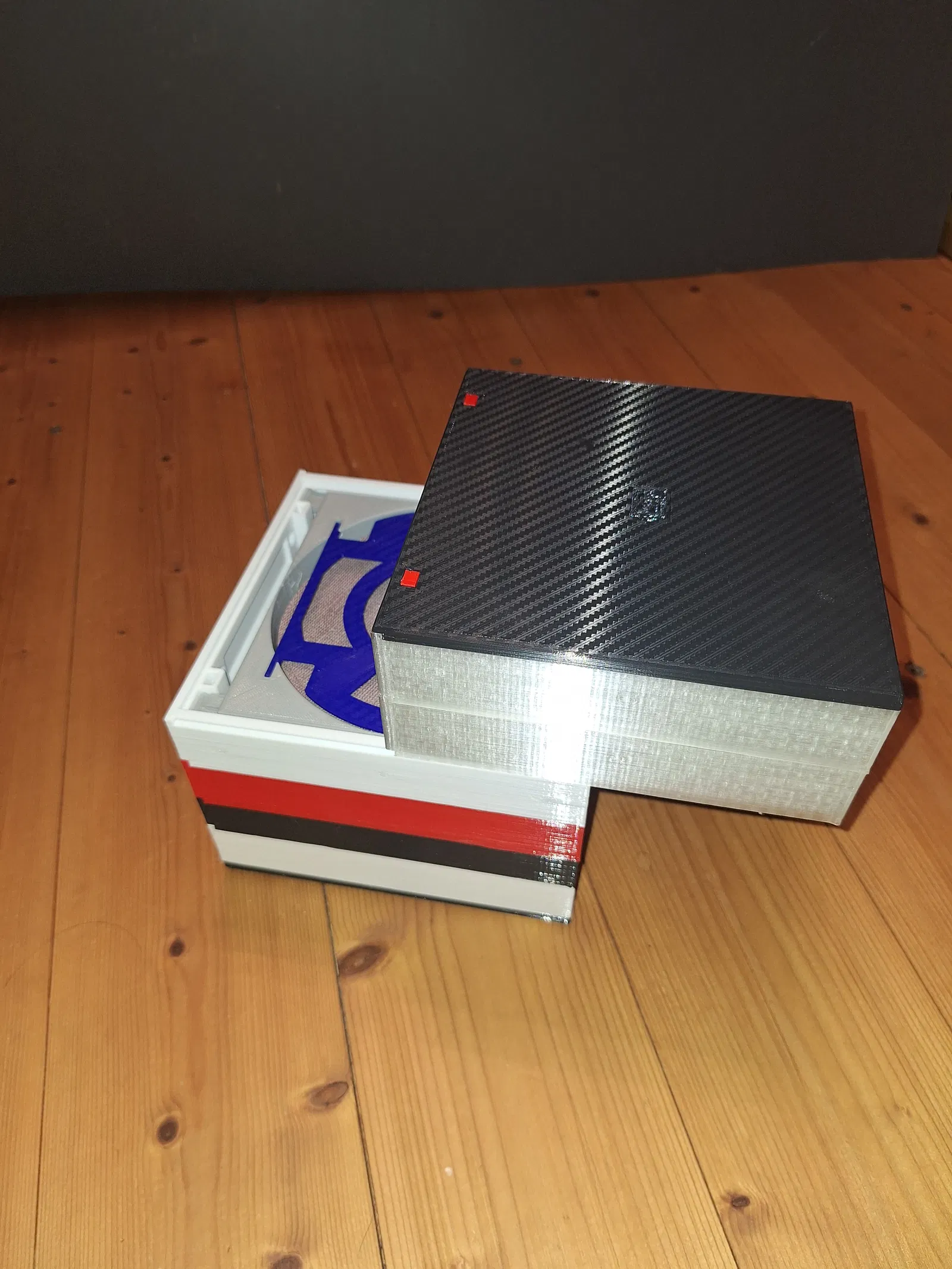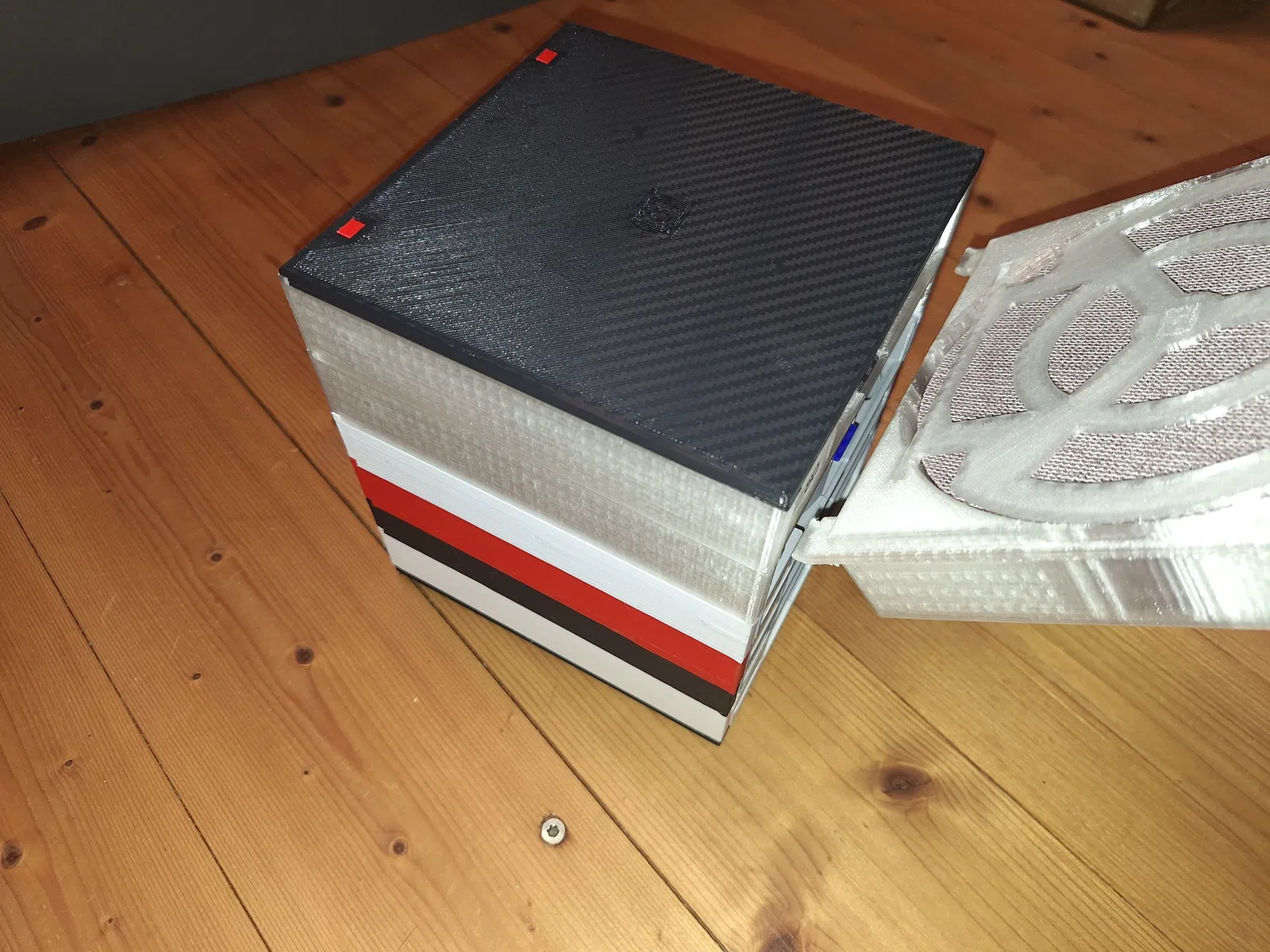 Nếu cần mang đi/di chuyển, các ngăn kéo có thể được khóa thêm để tránh trượt ra bằng một chốt gỗ tròn (dowel) 6 mm. Khi đó cần in nắp có các lỗ. Dowel có thể cất ở phía sau để khỏi bị thất lạc.