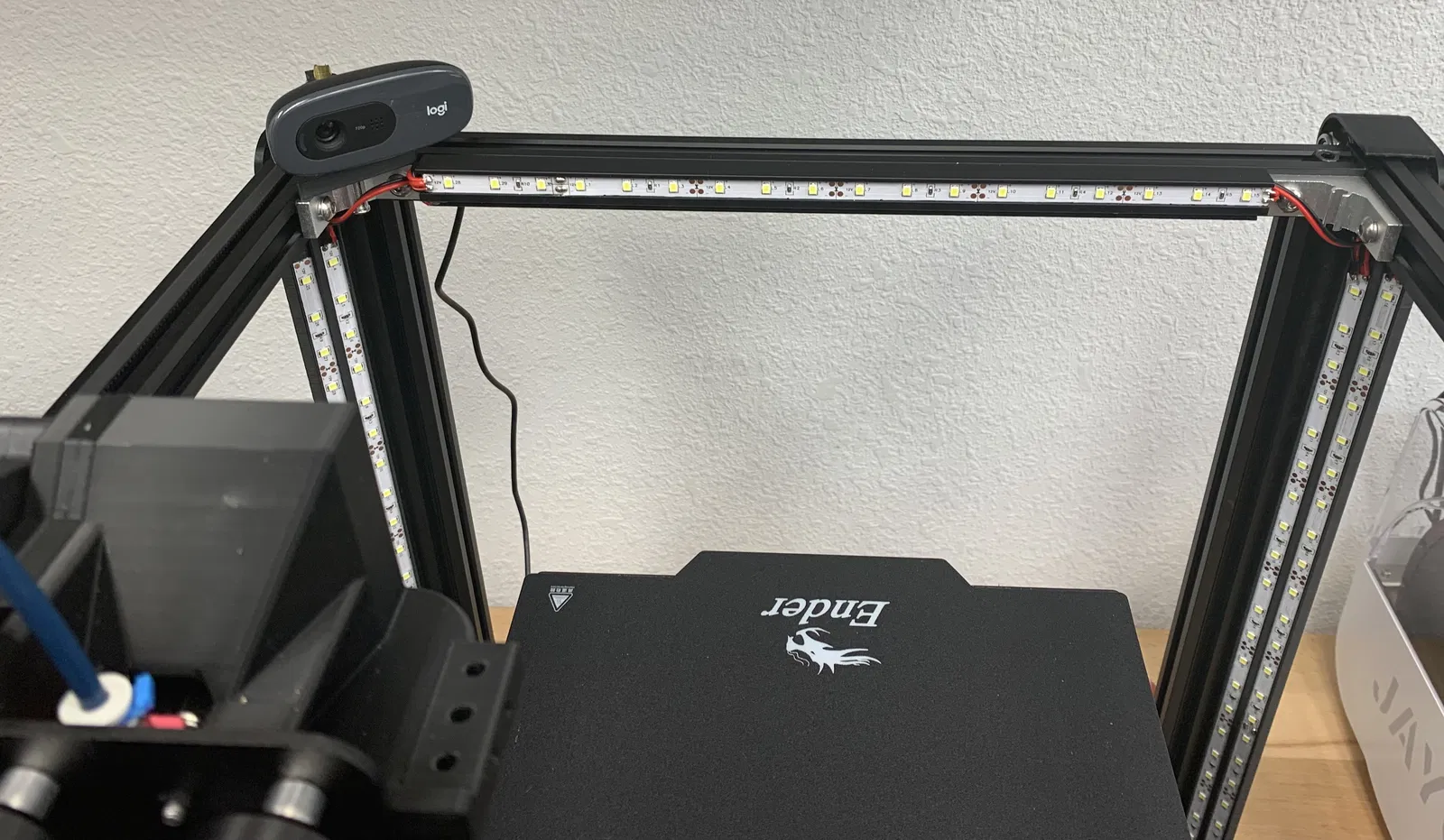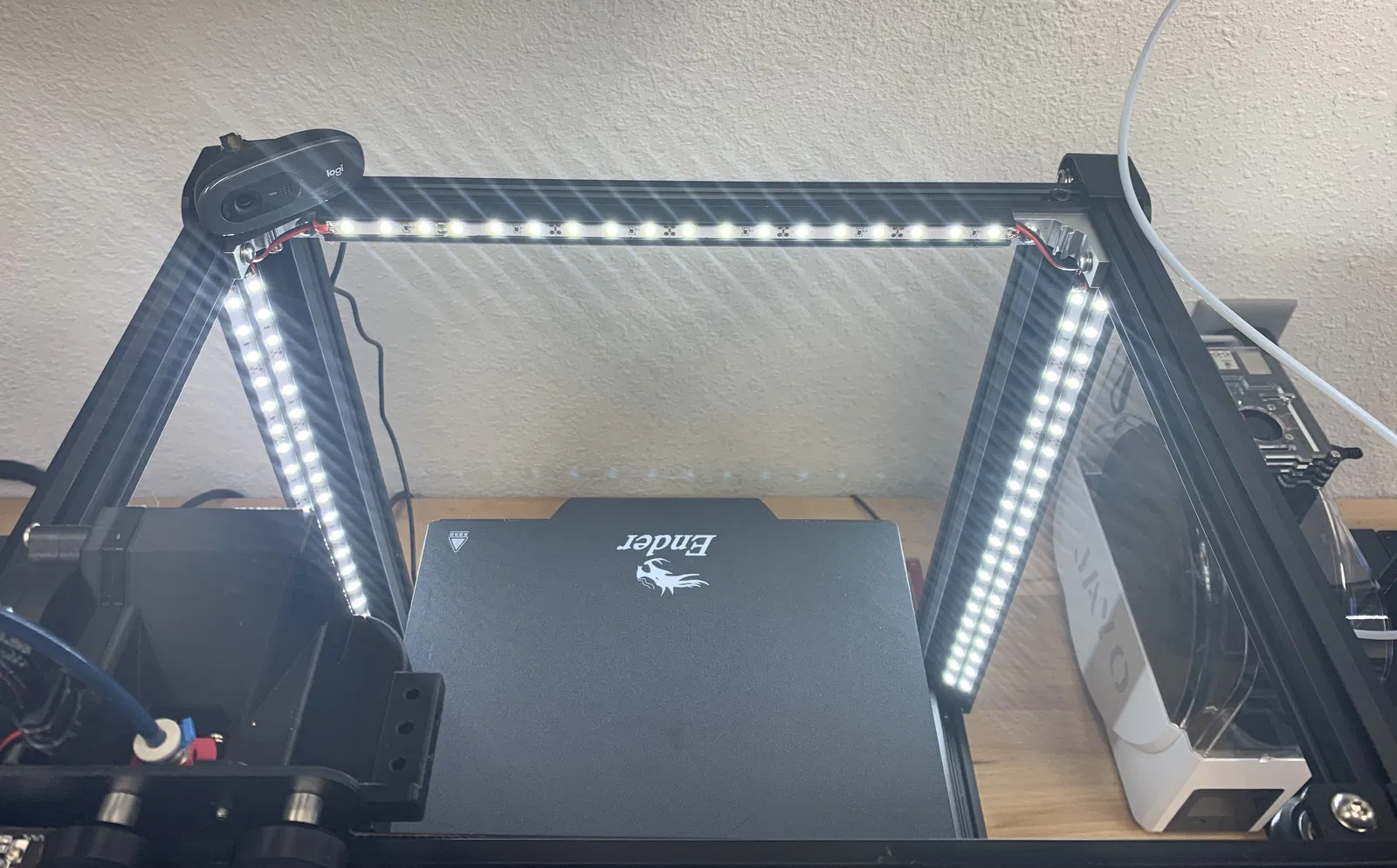Với ứng dụng trên Ender 5, bộ kết hợp này cho ánh sáng phủ đều khu vực làm việc từ Z=0 tới 300. Cách bố trí đèn giúp không bị chói mắt (trừ khi bạn đứng nhìn từ phía sau).