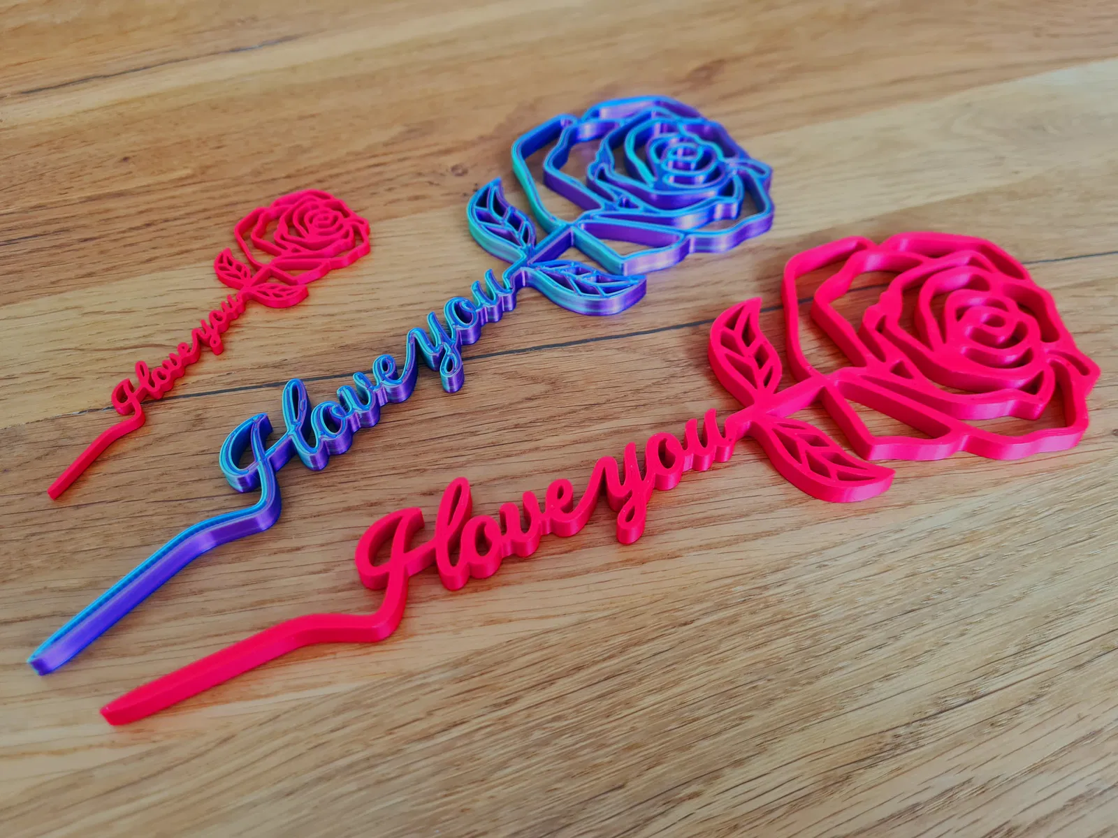 Bông hồng in 3D làm quà Valentine, phần thân có chữ “I love you” uốn lượn nổi bật. Có 2 size cao 220/110 mm, dễ in, không cần supports và có đế trưng bày tùy chọn.