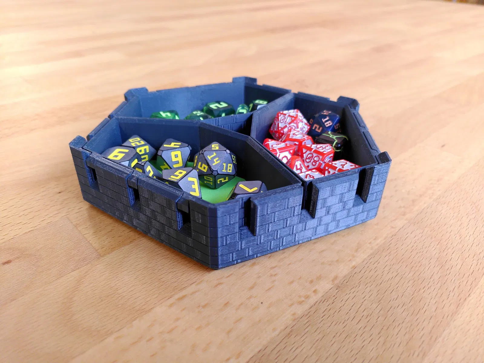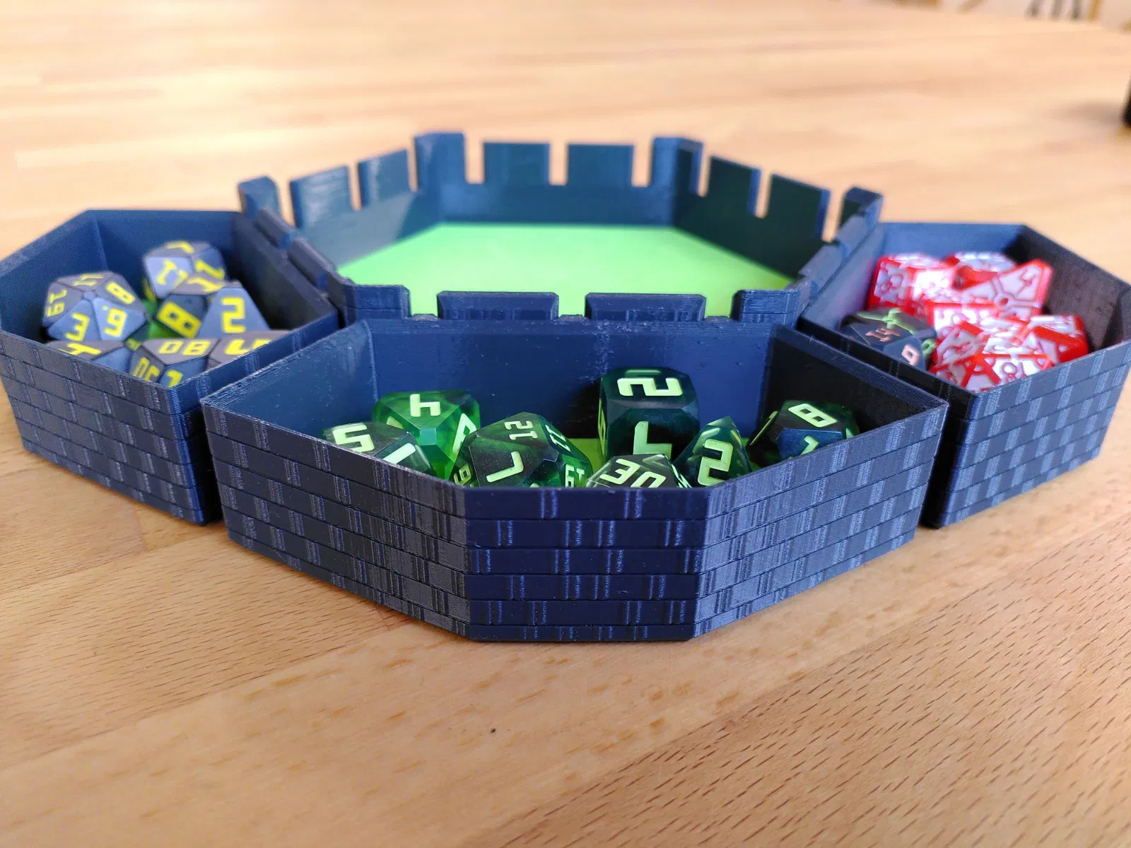 UPDATE – Part mới: Mình làm thêm phiên bản stackable. Bản này cao hơn một chút để chứa xúc xắc trọn vẹn, và các góc được nâng lên để tránh các khay xếp chồng bị trượt tách ra. Có 3 kiểu: blank, kiểu họa tiết hex tương lai (futuristic), và kiểu nhìn như lâu đài thời trung cổ.