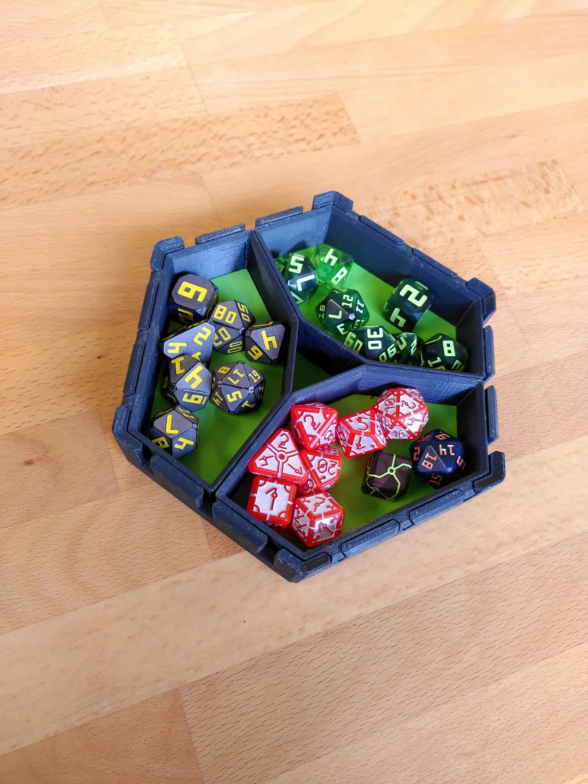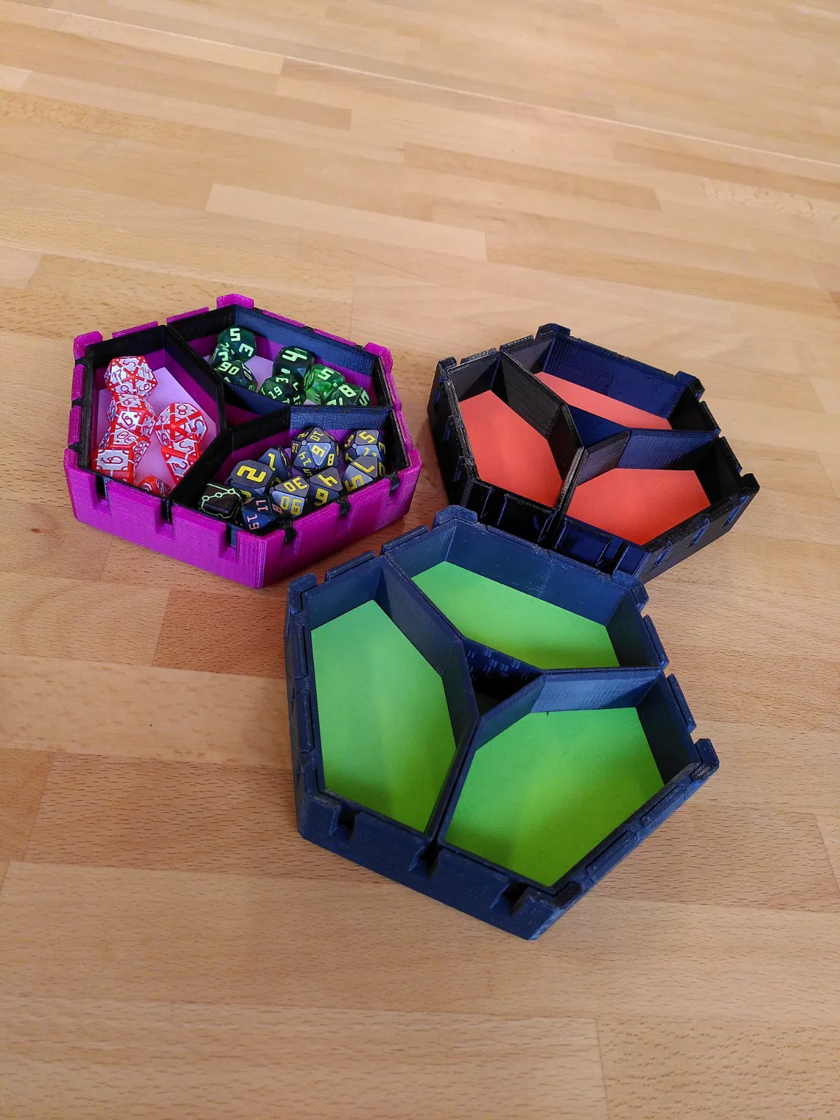 Lúc chơi game mà có sẵn vài viên xúc xắc trong tầm tay thì lúc nào cũng tiện, mà nếu được sắp xếp gọn gàng, phân loại rõ ràng nữa thì trải nghiệm chơi sẽ mượt hơn nhiều. Nhưng mấy loại organizer với tray thường chiếm khá nhiều chỗ, nên mình làm cái khay lục giác dạng lồng (nested) này. Bạn có thể dùng khay chính một mình, hoặc gắn thêm tối đa 3 khay nhỏ. Nếu muốn “chơi lớn”, bạn còn có thể gắn tới 6 khay nhỏ xung quanh khay chính.