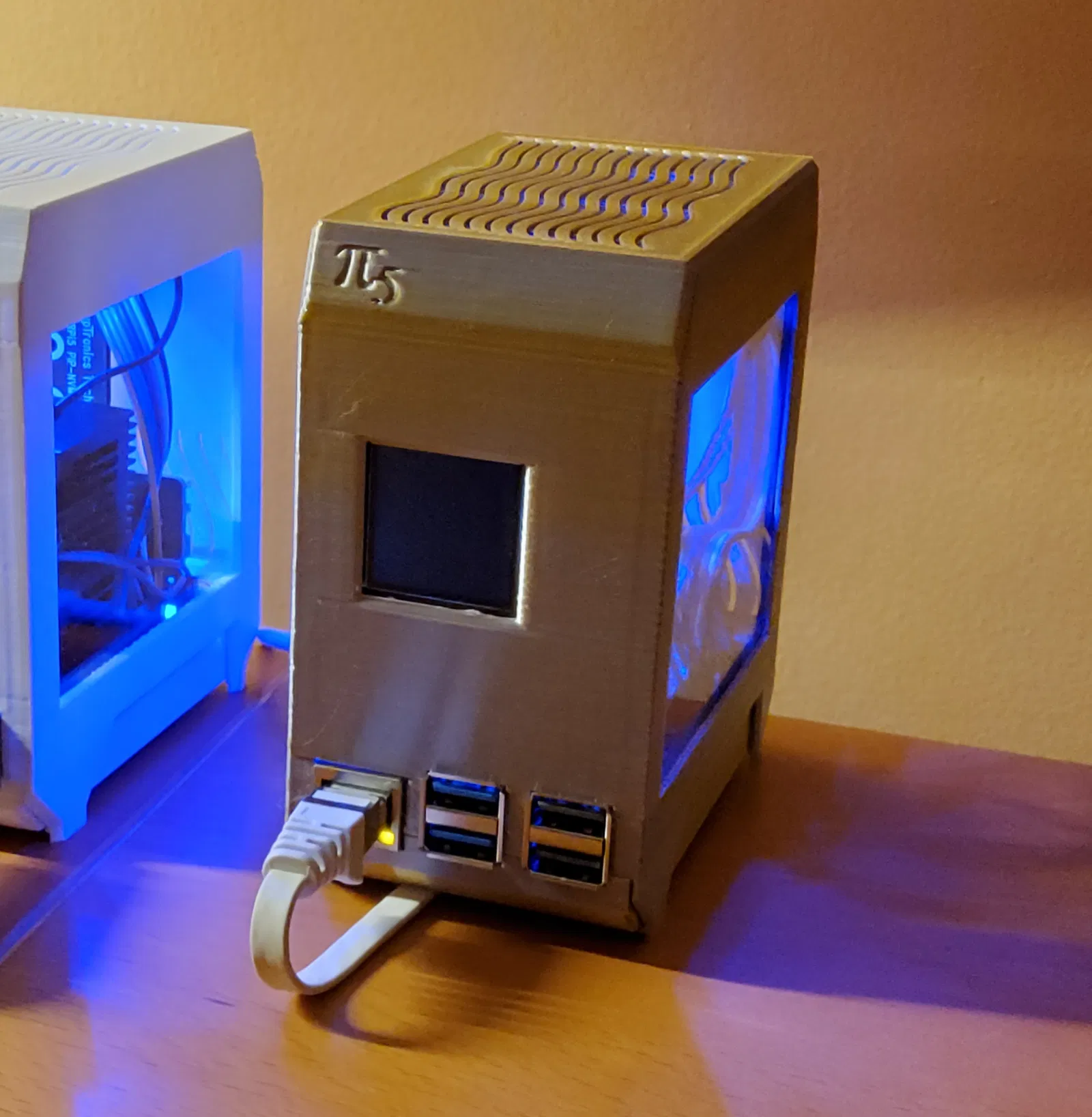 Vỏ máy tính mini-tower cho Raspberry Pi 5 với cửa sổ acrylic và bo mạch con (daughter board) NVME. Hầu như NVME HAT nào cũng xài được, nhưng mình dùng loại ElectroCookie slim vì kiểu dáng tối giản và chất lượng ổn.