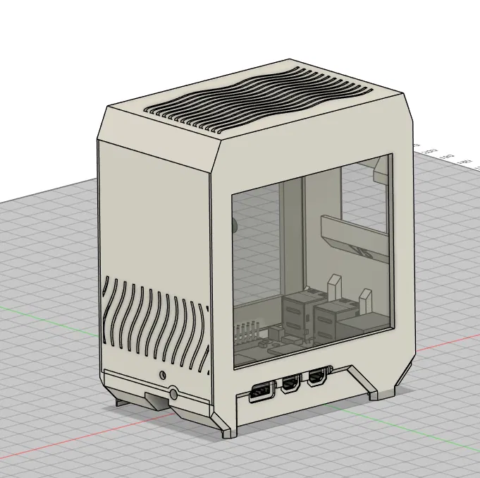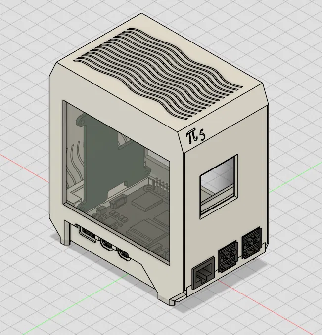 Vỏ mini-tower cho Raspberry Pi 5 có cửa sổ acrylic và hỗ trợ NVMe HAT (đã thử ElectroCookie slim). Thiết kế dạng kẹp, có thể thêm ốc M3 phía sau. Dùng tấm acrylic 2mm cắt 98×87mm, không cần dán keo.