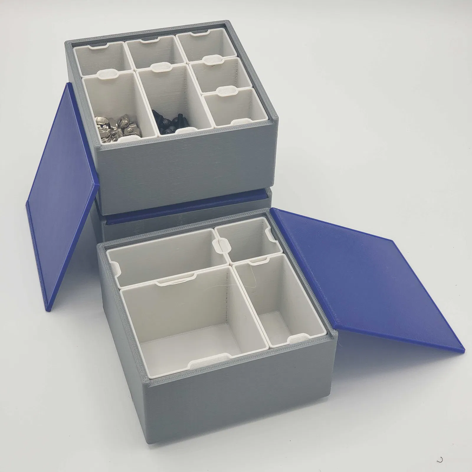 Hộp lưu trữ xếp chồng dạng parametric với các insert modular, giúp sắp xếp linh kiện nhỏ như ốc vít, phụ kiện, chi tiết máy. Phù hợp in 3D để quản lý đồ đạc gọn gàng, dễ phân loại.