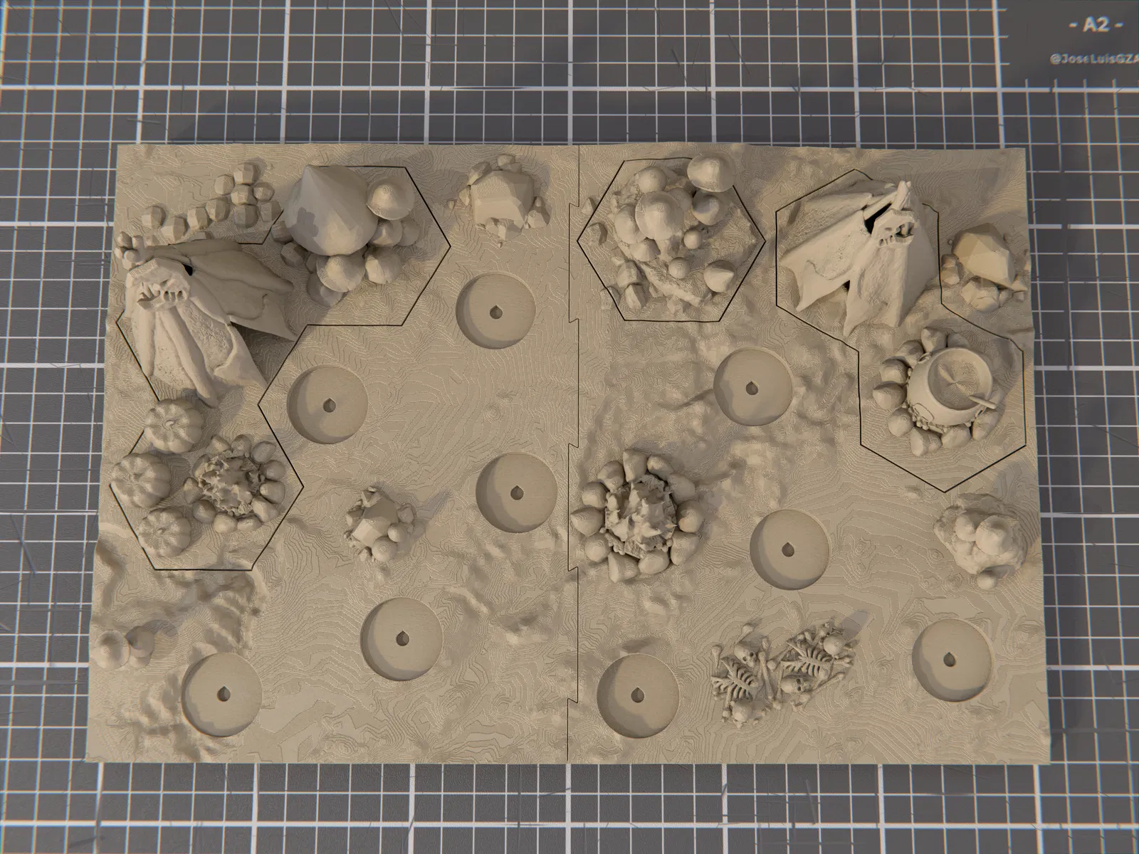 - 2024/09/03: Cập nhật lên V2, kèm hệ khớp nối mới, kích thước mới, vài chỉnh sửa nhỏ về bố cục cảnh, và thêm lỗ gắn nam châm 4x2mm ở mặt dưới đế, hai bên, các mảnh hex terrain, cùng các vị trí đặt miniature.