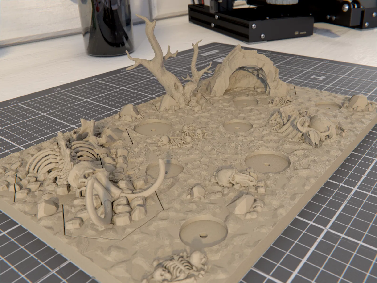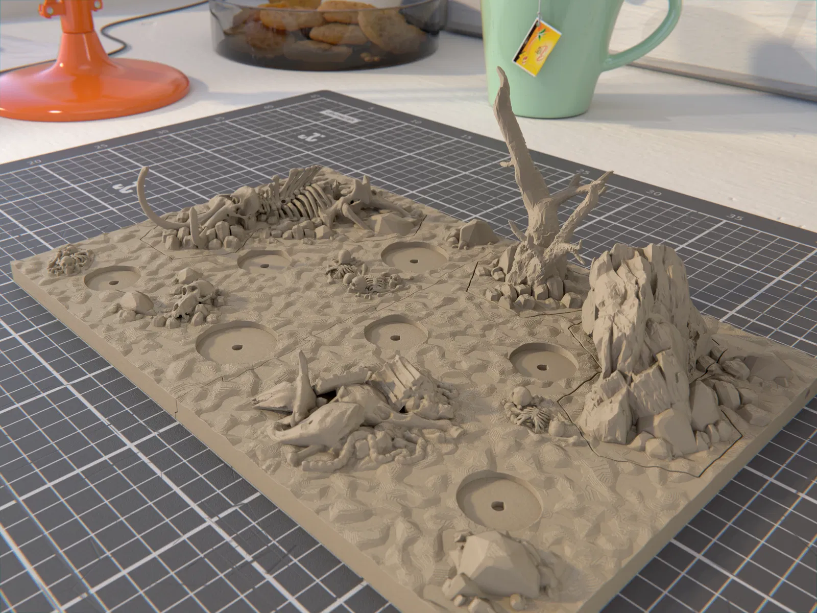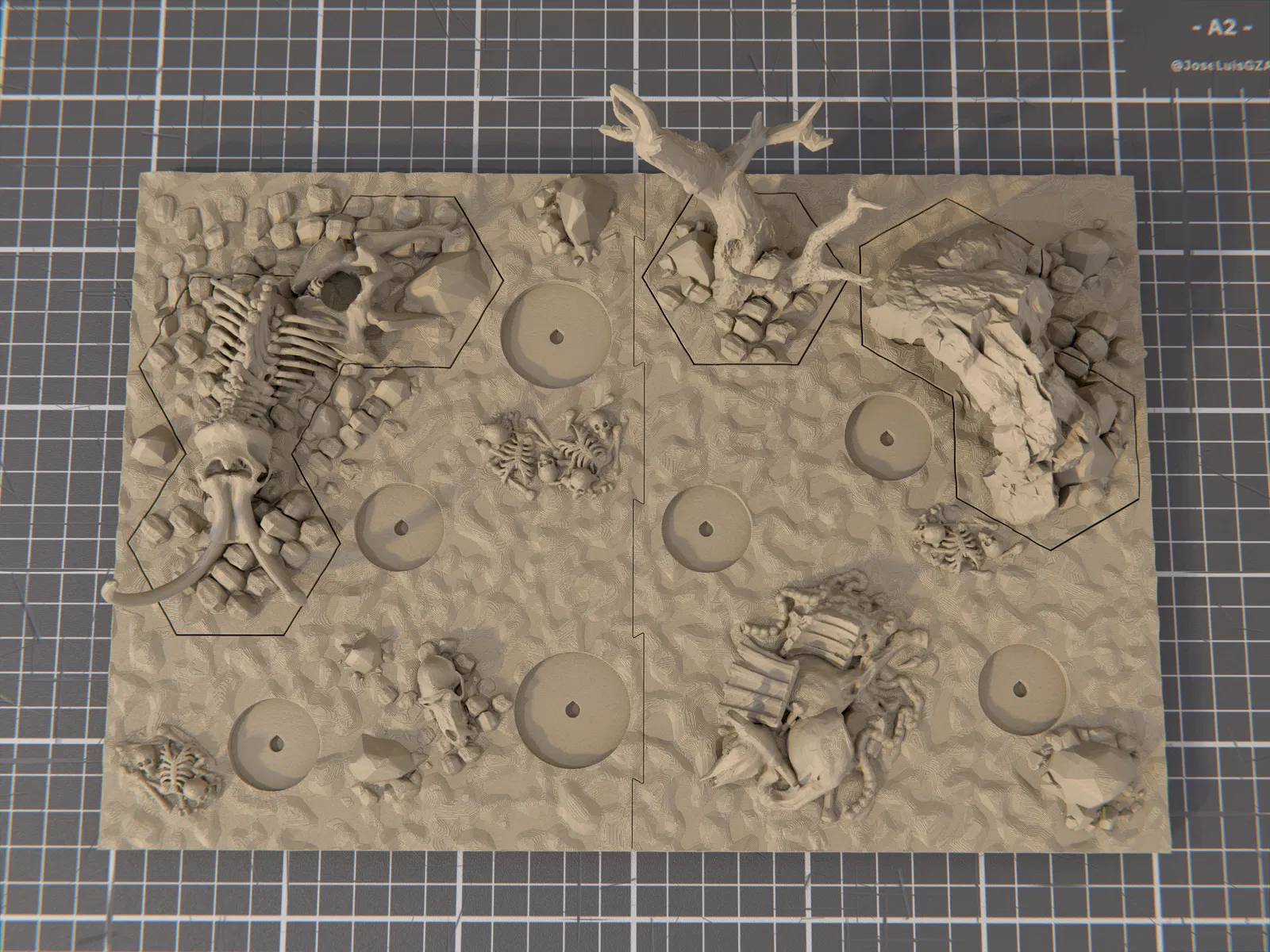 • 2024/09/01: Cập nhật lên V2, kèm hệ khớp nối mới, kích thước mới, vài thay đổi nhỏ trong bố cục cảnh, và lỗ gắn nam châm 4x2mm ở mặt dưới đế, hai bên, các mảnh hex terrain, và các vị trí đặt miniature.