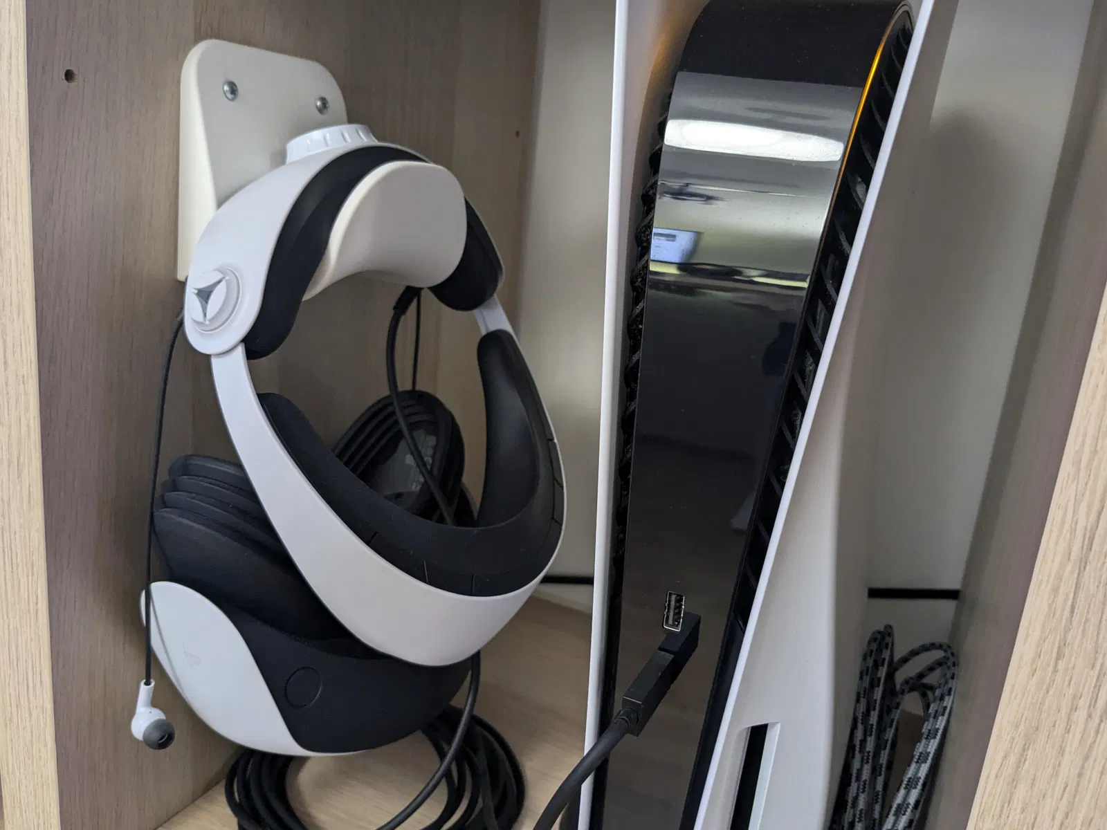 Đế treo tường đơn giản mà tiện dụng cho headset PS5 VR2. Nếu cần, bạn có thể in thêm một cái nữa để cuốn gọn dây cáp.
