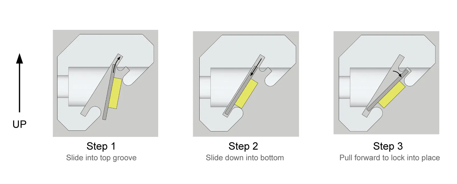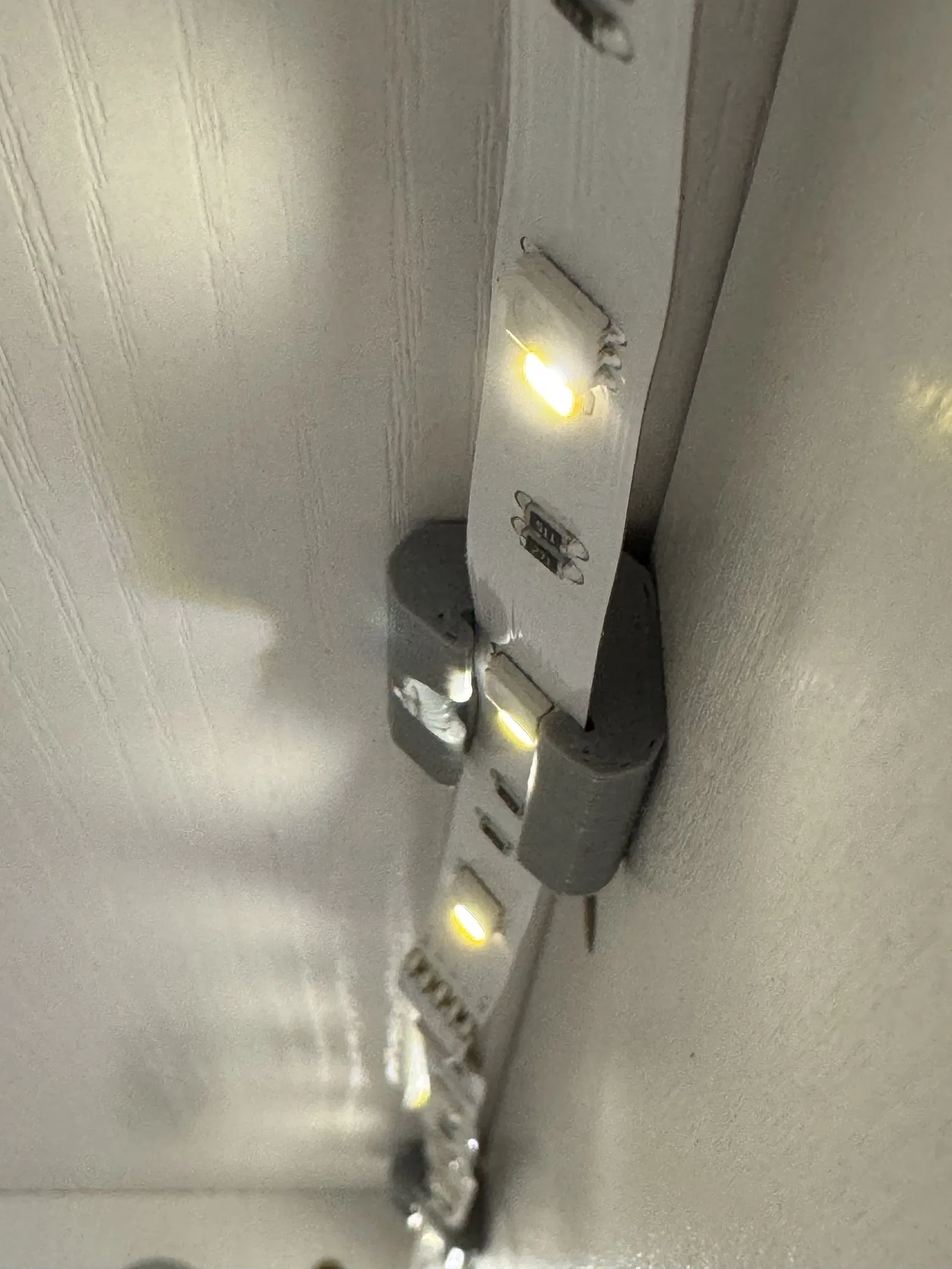 Ngàm/giá đỡ gắn góc cho LED strip bản 10mm. Giúp đặt dải đèn ở góc 45 độ và dễ dàng gắn/tháo LED strip sau khi đã lắp giá đỡ xong. Làm theo quy trình 3 bước để khóa cố định vào đúng vị trí.