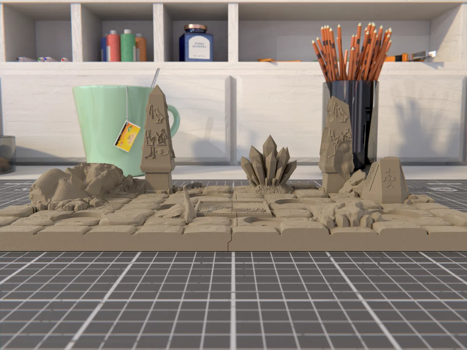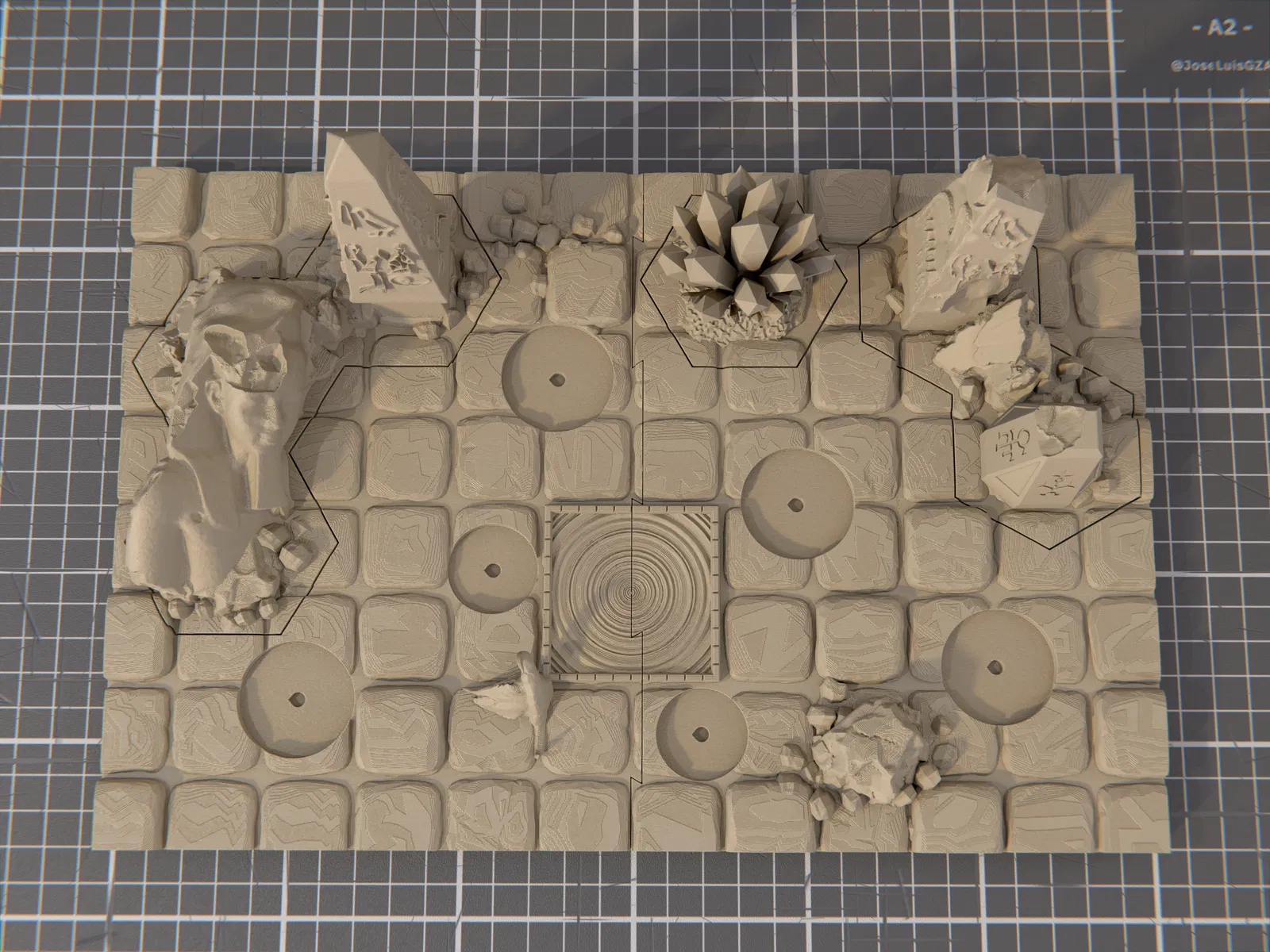 - 2023/08/05: Cập nhật lên V2, có vài thay đổi nhỏ về bố cục cảnh, và thêm lỗ gắn nam châm 4x2mm ở mặt dưới đế, hai bên, các mảnh hex terrain, cùng các vị trí đặt miniature.