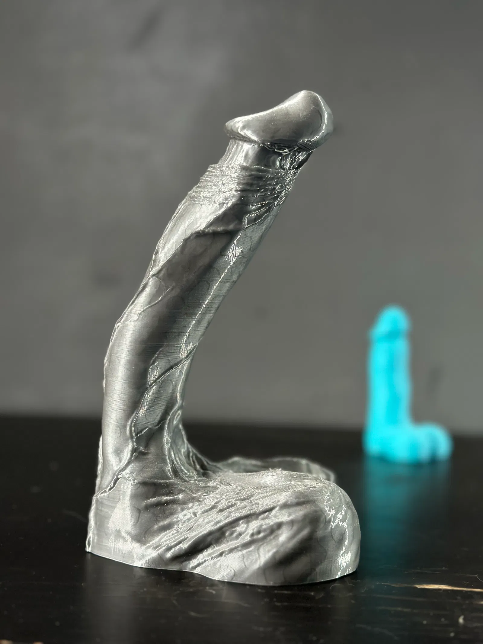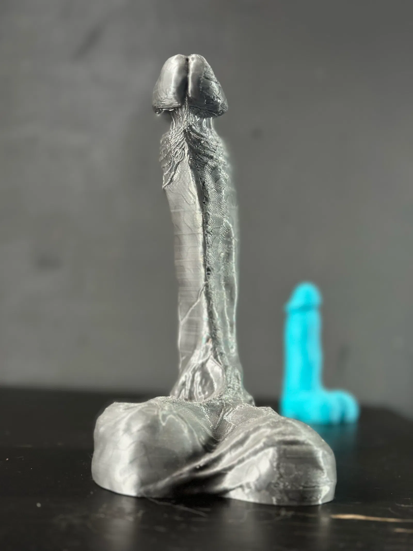 Mẫu tượng NSFW lấy cảm hứng từ “đồ thật” nhưng được biến tấu theo trí tưởng tượng. Thiết kế theo yêu cầu: mỏng, dài, cong và kèm cặp tinh hoàn lớn, phù hợp để trưng bày hoặc làm đạo cụ.