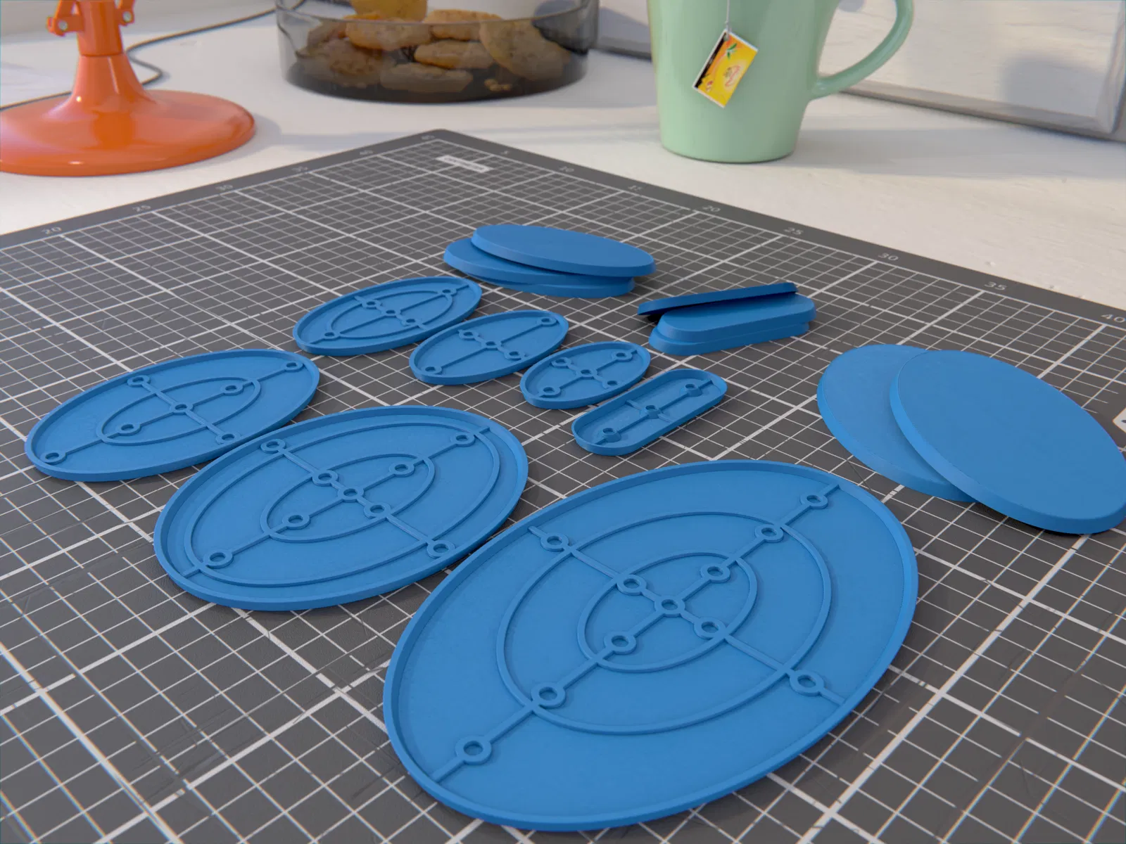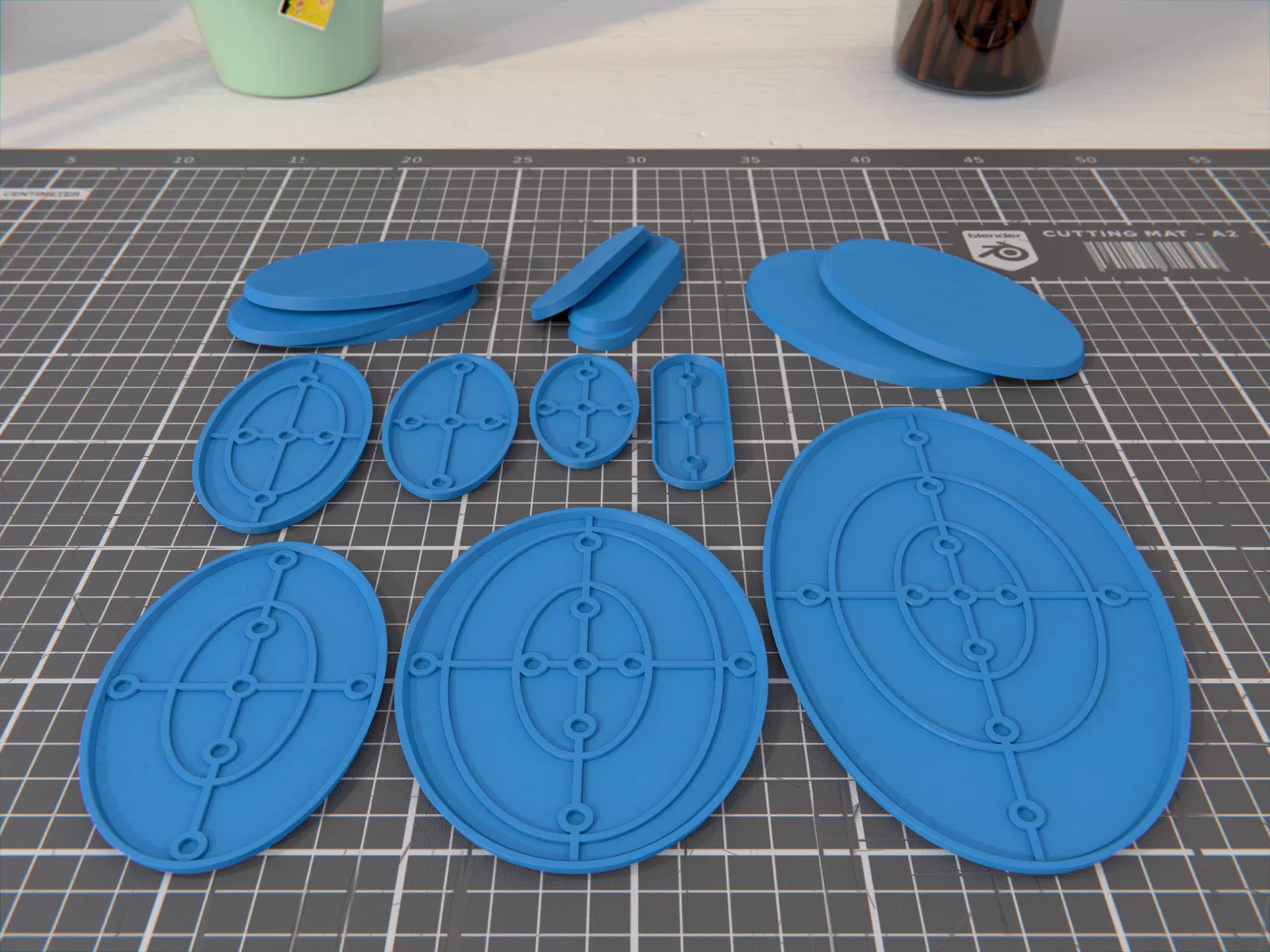 Bộ đế oval cho wargaming, tối ưu để gắn nam châm 4x2mm. Cao 4 mm, nhiều size từ 70x25 đến 170x105 mm—hợp cho các hệ như Warhammer 40k, AoS, Infinity và các game mini 28mm.