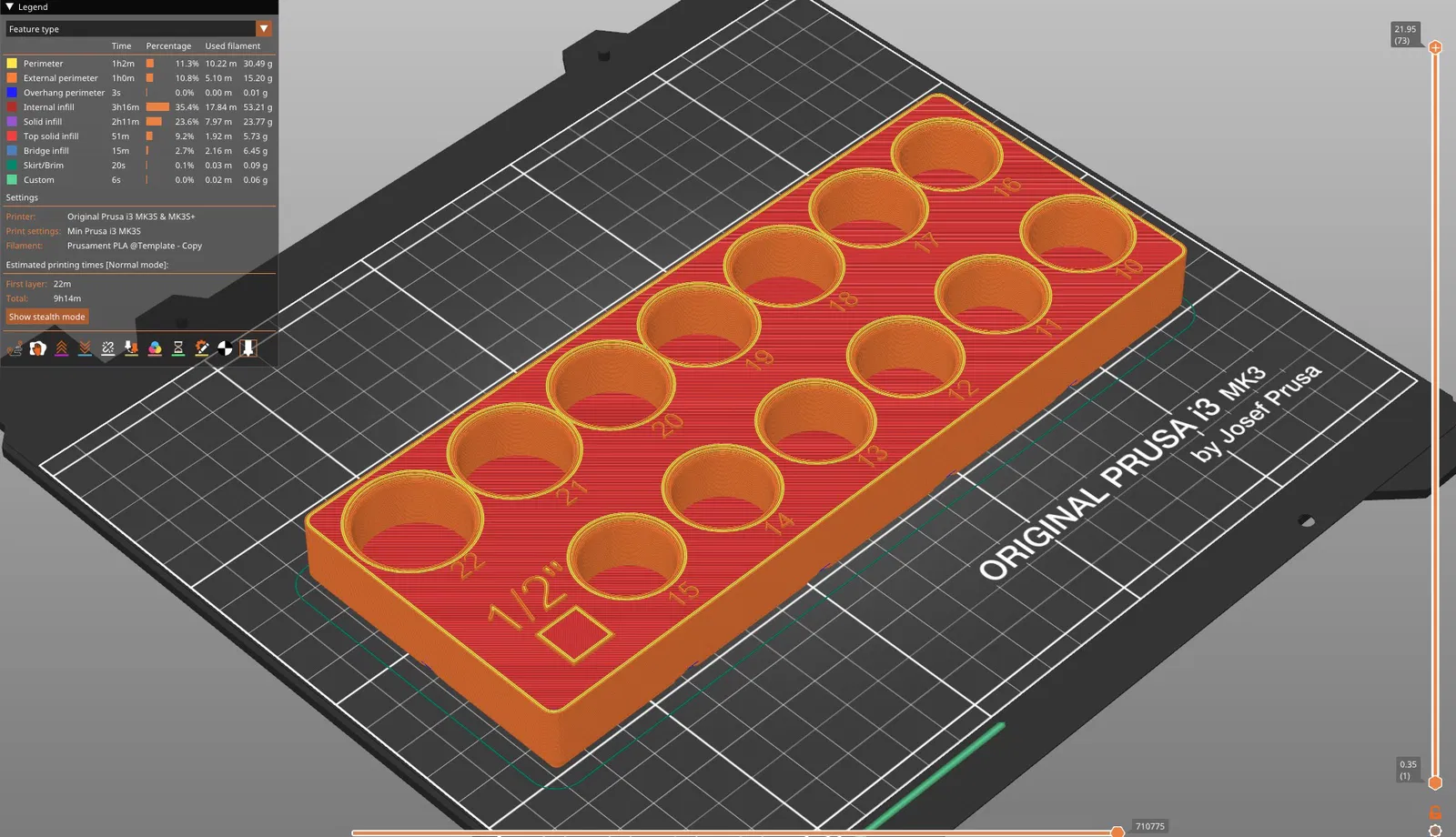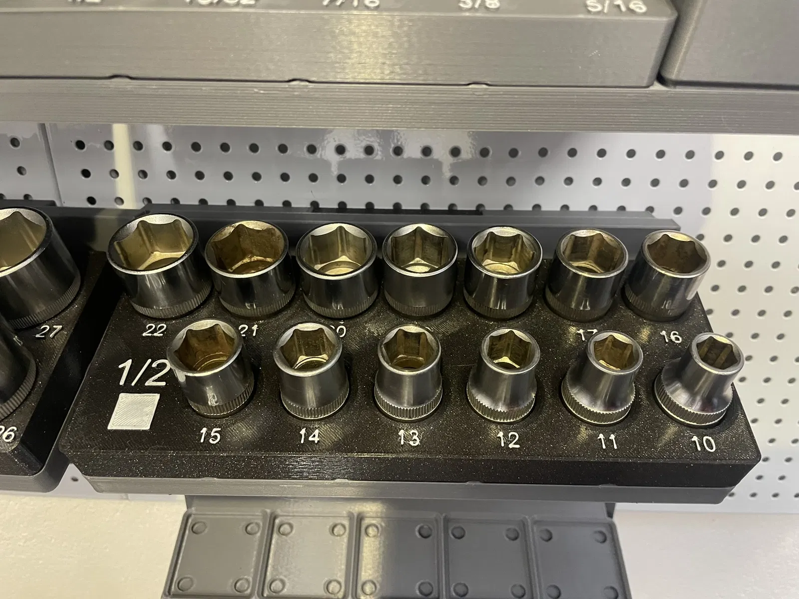 Module Gridfinity bin 2x5 để giữ đầu tuýp hệ metric từ 10 đến 22, dùng với cần siết 1/2" drive. Khuyến nghị in 10% gyroid/grid infill, không cần support; có thể treo peg board/tường qua holder/adapter.