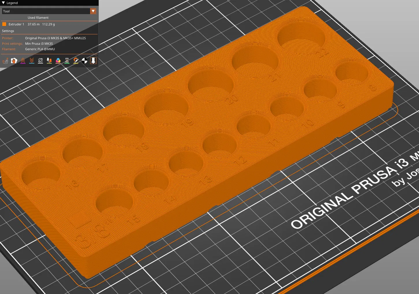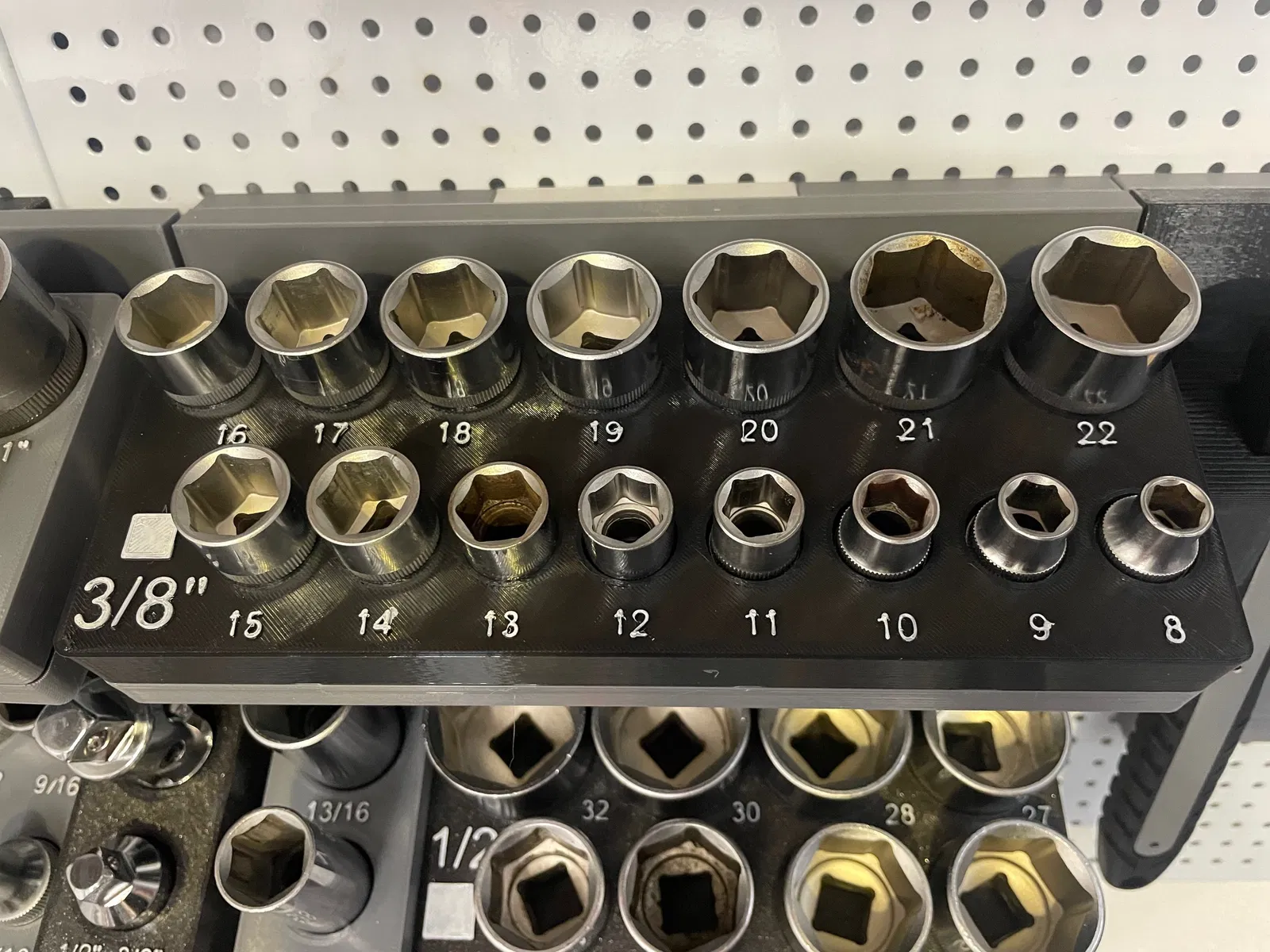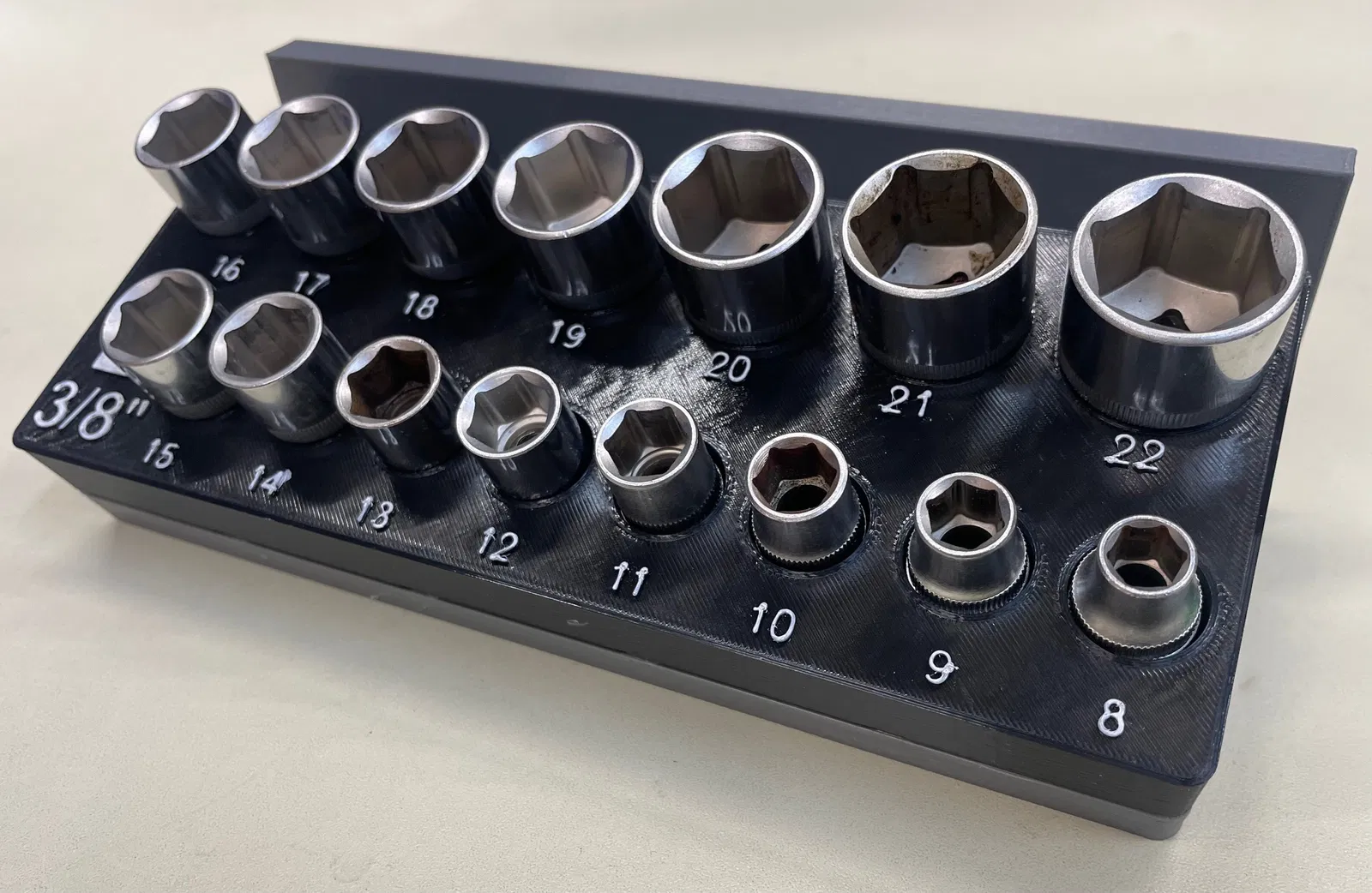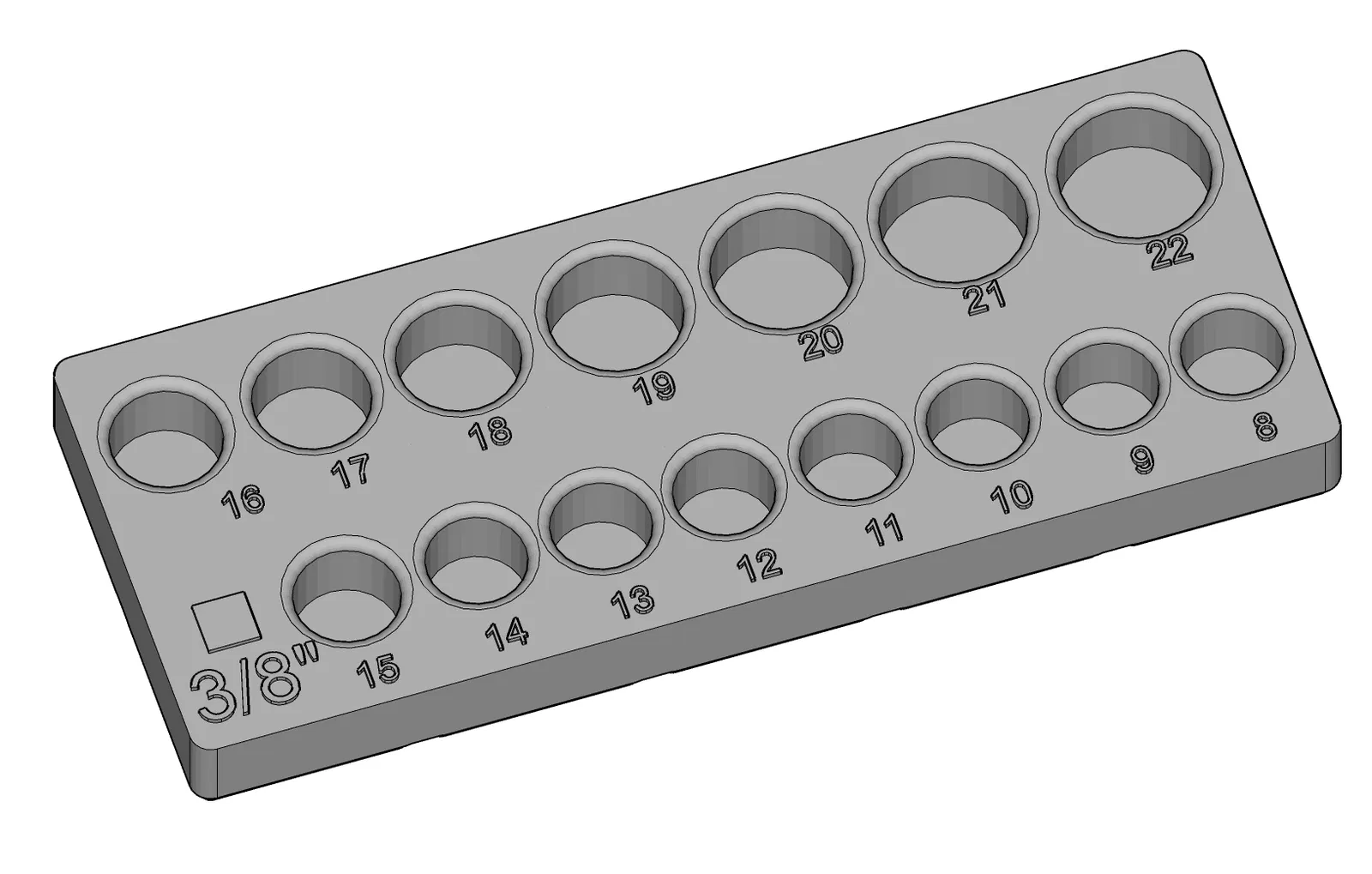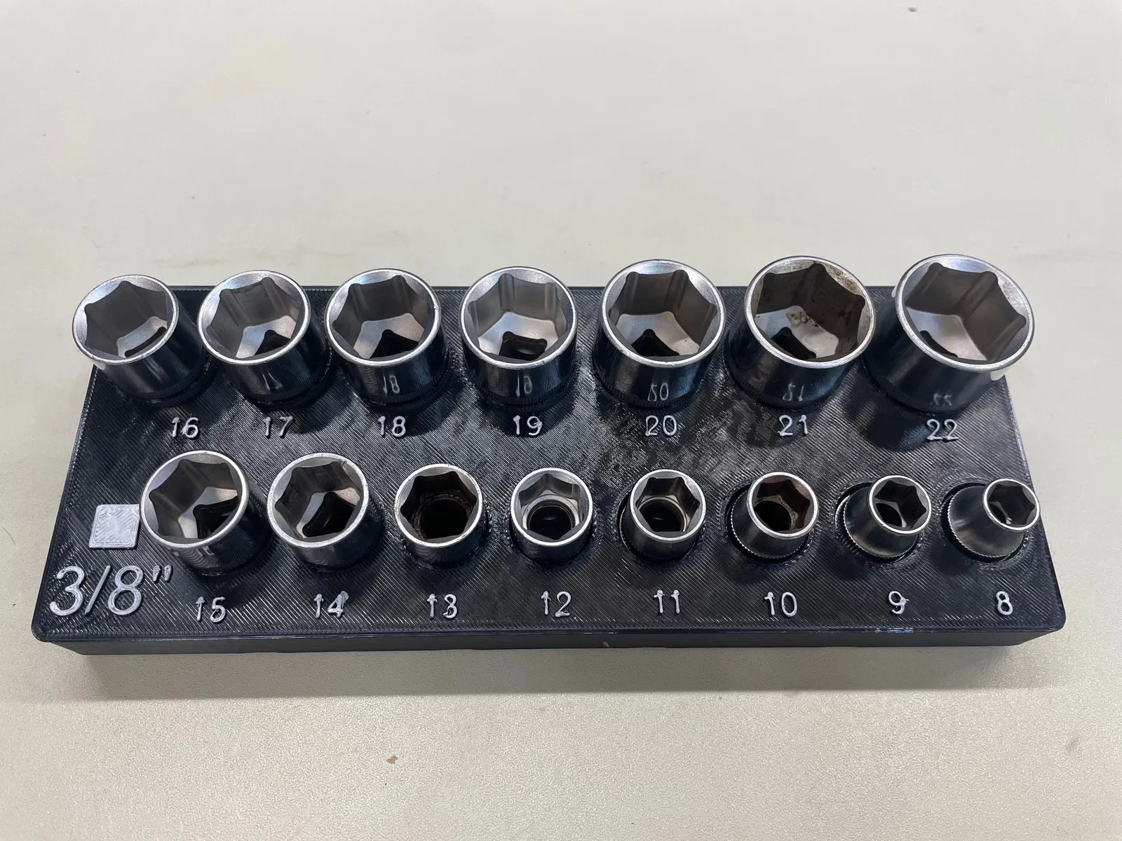 Khay giữ socket hệ metric từ 8 đến 22 cho cần siết (ratchet) đầu 3/8", thiết kế theo Gridfinity bin 2x5. In khuyến nghị infill 10%. Có thể treo lên peg board/tường qua Gridfinity 2x5 holder (MODULA).