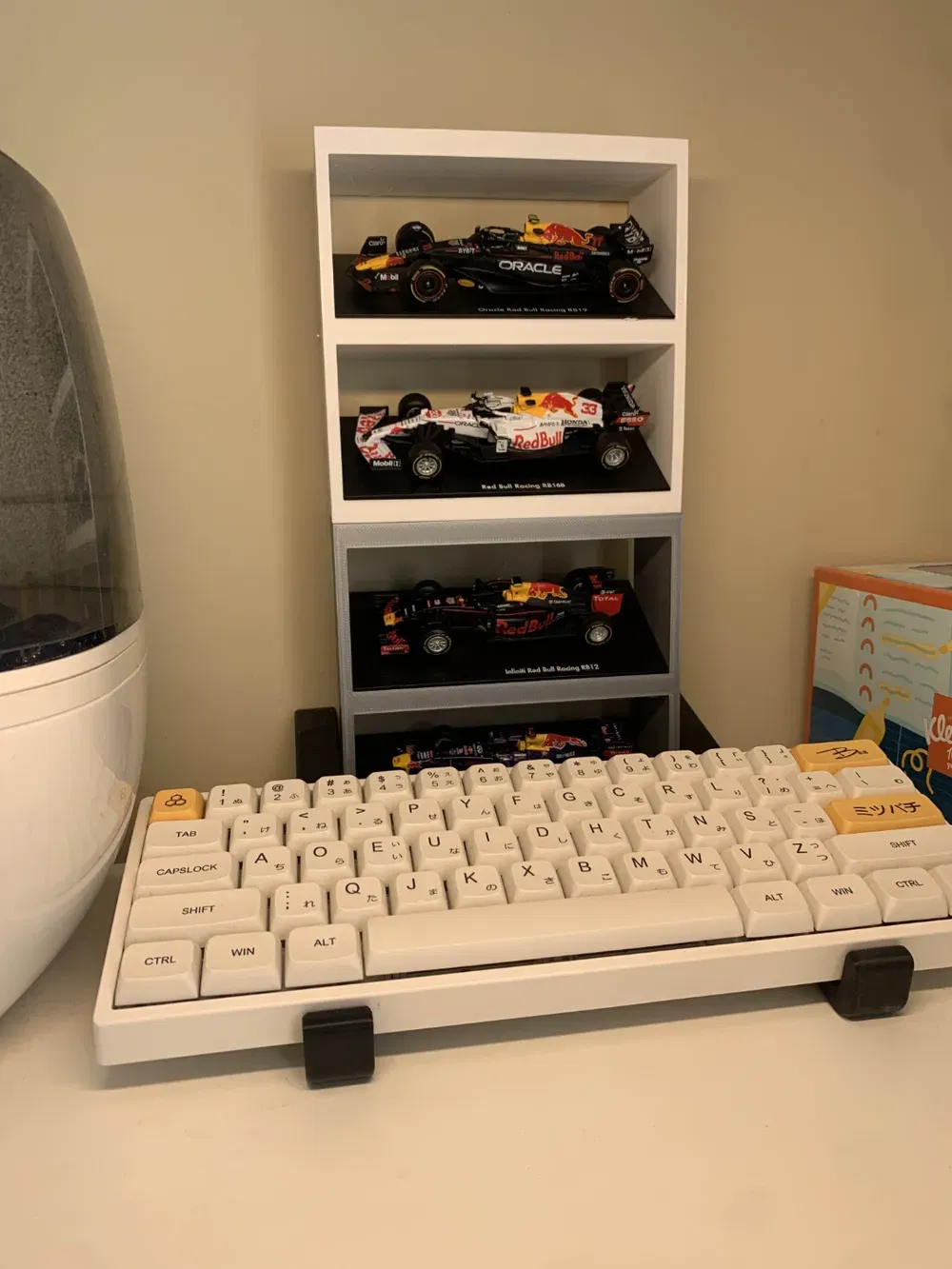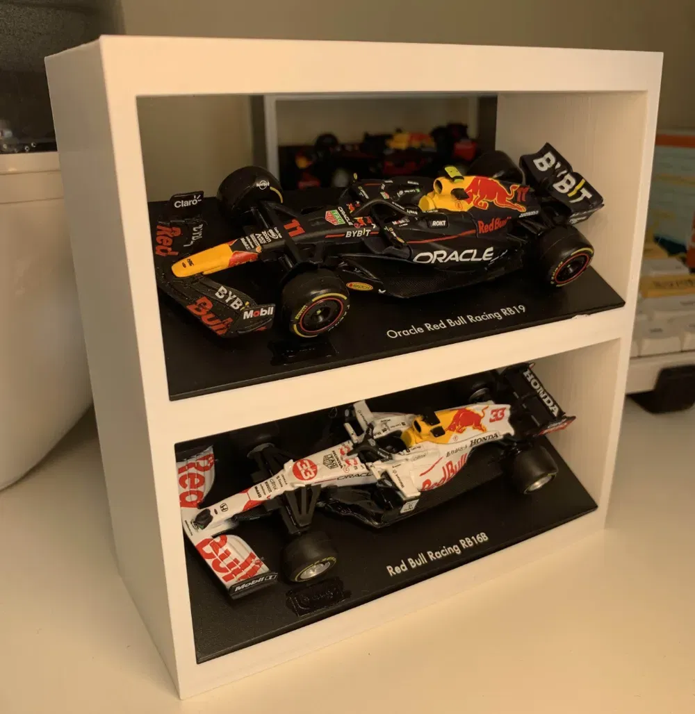 Kệ trưng bày 2 tầng dành cho xe diecast F1 Bburago tỉ lệ 1:43. Xe lắp từ phía sau; để đủ khoảng hở tầng trên cần tháo xe khỏi đế zin và có thể dùng một đoạn filament thay ốc để giữ xe cố định.