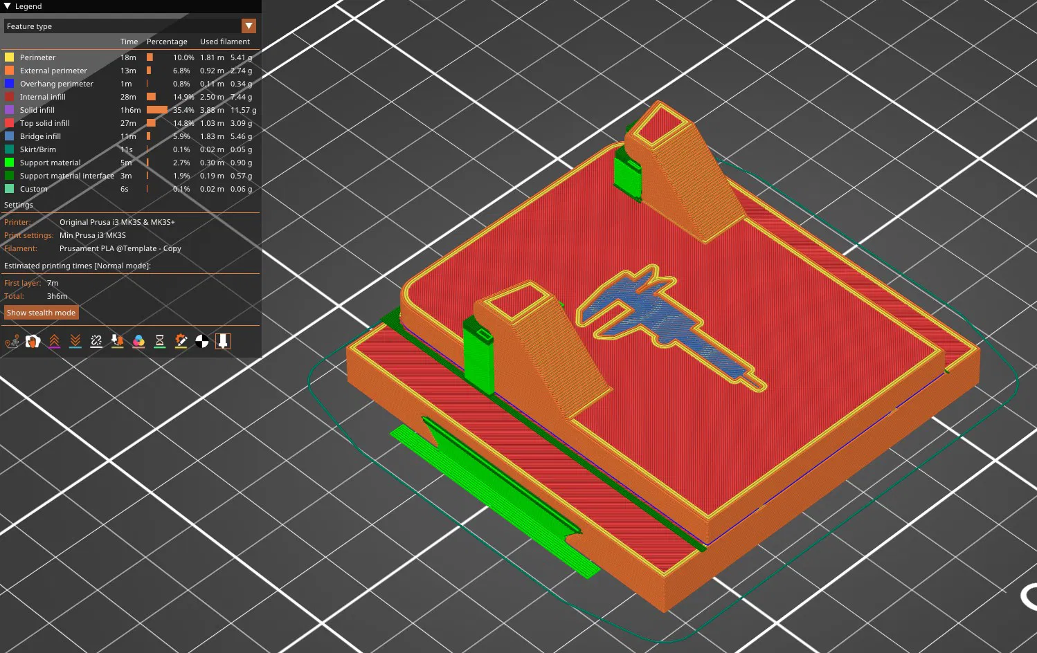 In theo kiểu “nằm ngửa” (print “on it's back”) với infill gyroid/grid 10% và bật support từ mọi phía.
