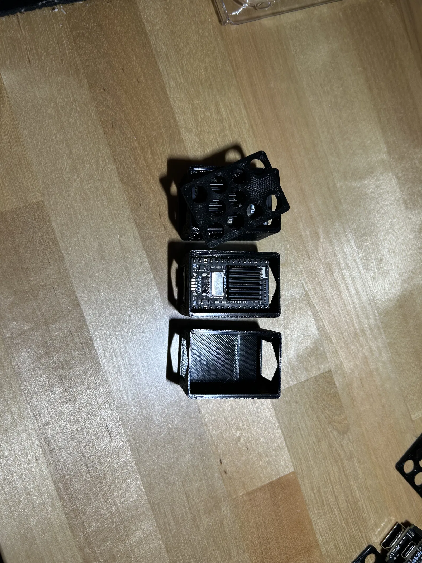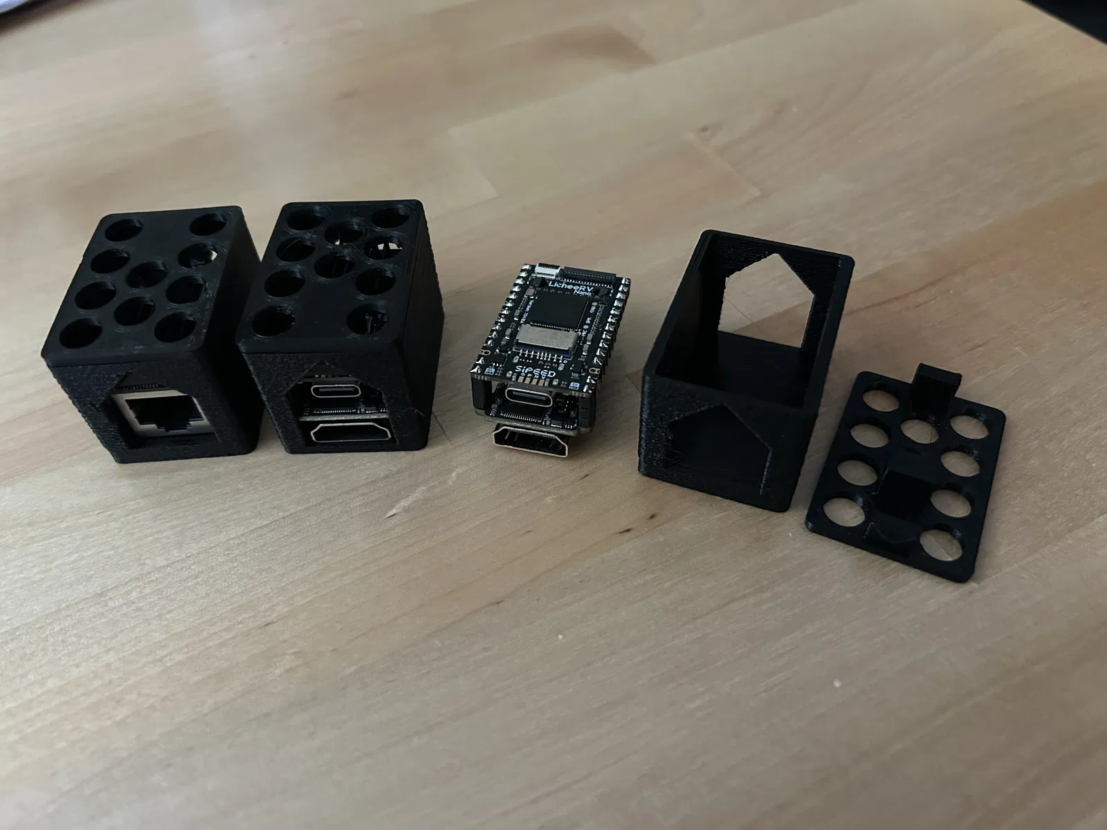 Có nhiều mẫu vỏ NanoKVM khác, nhưng mình muốn một cái có thể in không cần supports để làm vỏ vừa dễ in vừa nhìn đẹp. Model này được thiết kế có tính tới heatsink, nhưng heatsink là tùy chọn. Lắp vào rất đơn giản: đặt NanoKVM vào vỏ sao cho phía HDMI khớp với phía có phần lõm. Dù lực ma sát thường đã đủ để giữ NanoKVM trong vỏ, bạn cũng có thể chấm một ít keo nến (hot glue) lên mặt trên của đầu RJ45 trước khi lắp NanoKVM vào vỏ để yên tâm hơn.