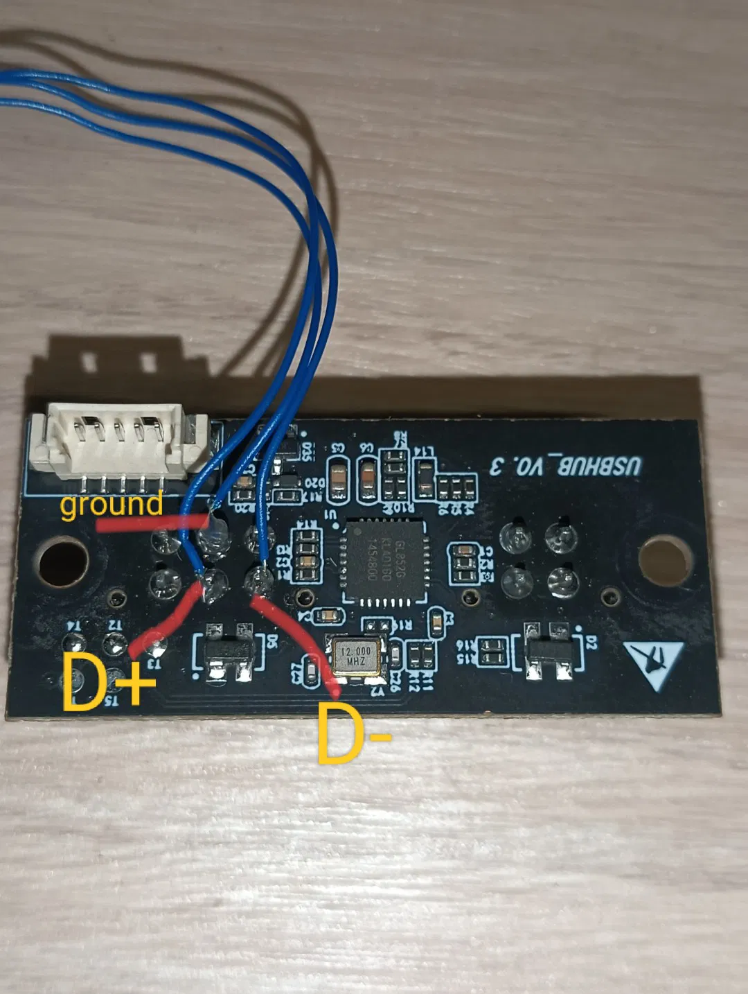 Hàn 3 sợi dây như trong hình, mình khuyên dùng AWG28 hoặc AWG30. Bạn chỉ cần nối Ground, D+ & D-, không nối VCC.