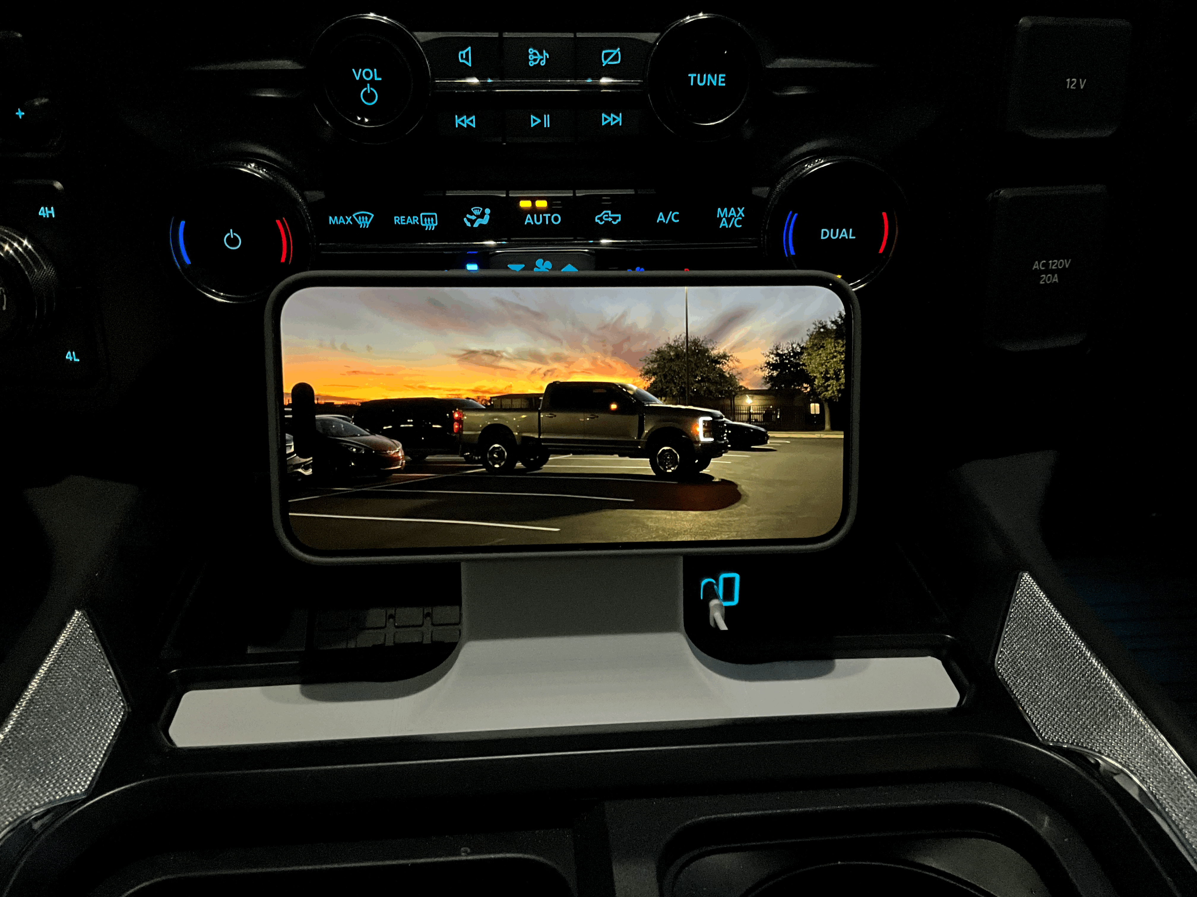 Giá đỡ MagSafe thiết kế để gắn vừa khít vào khay phía trước cụm console của Ford Super Duty 2023+. In thử với layer height 0.2, nozzle 0.4; dung sai sát nên cần ấn mạnh lúc lắp nhưng lên xe rất chắc.