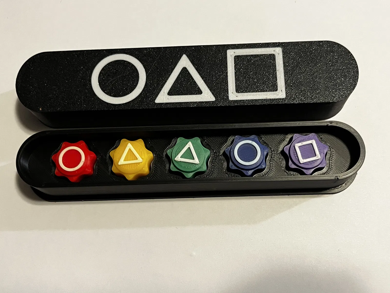Bản remix hộp đựng Gonggi: scale lên 107.5% để vừa bộ xúc xắc đã in, đồng thời chỉnh lại hoạ tiết trên nắp cho đồng nhất, hình to hơn và fillet nhỏ hơn. Có sẵn nắp multi-color và nắp màu trơn.