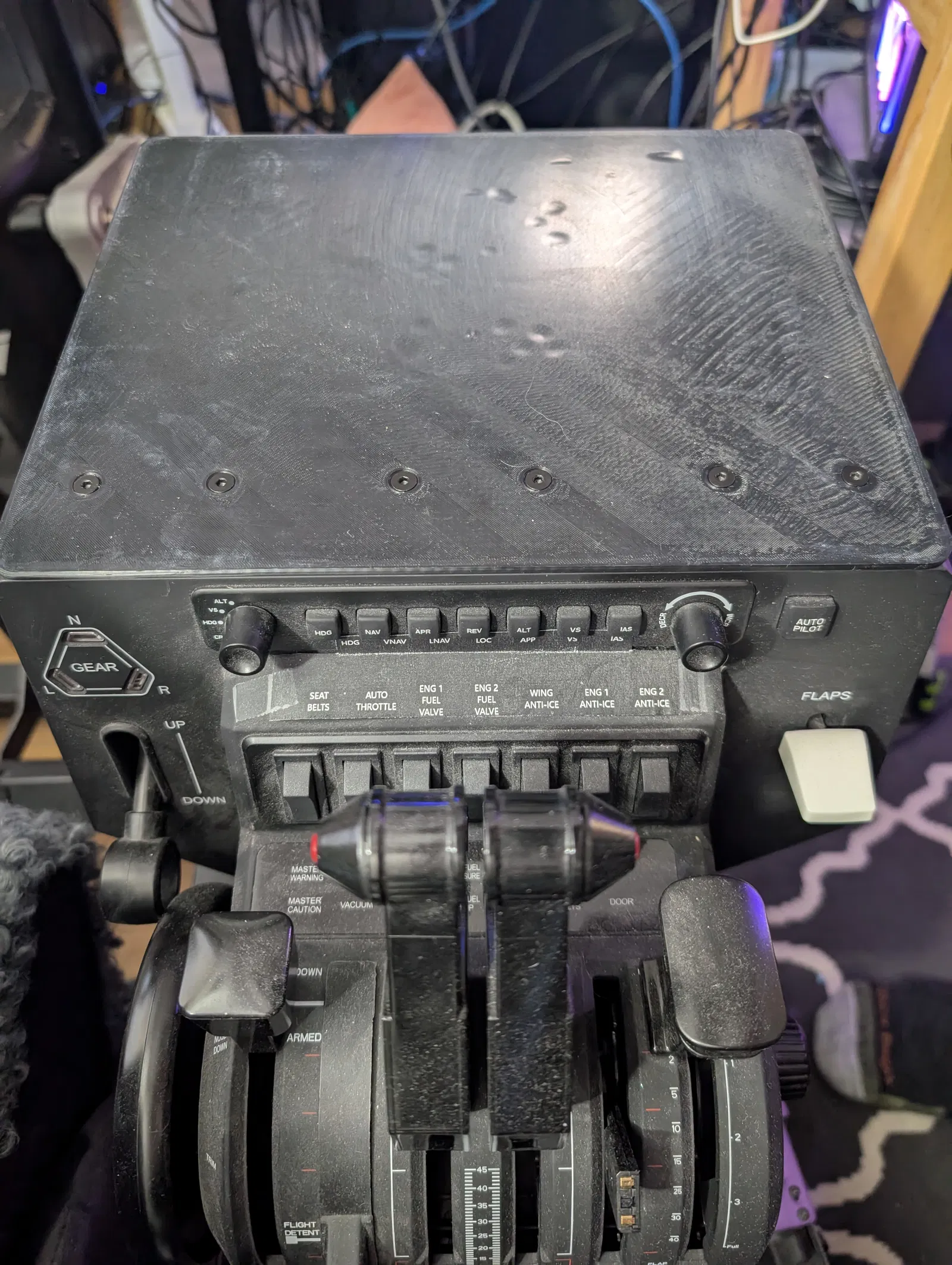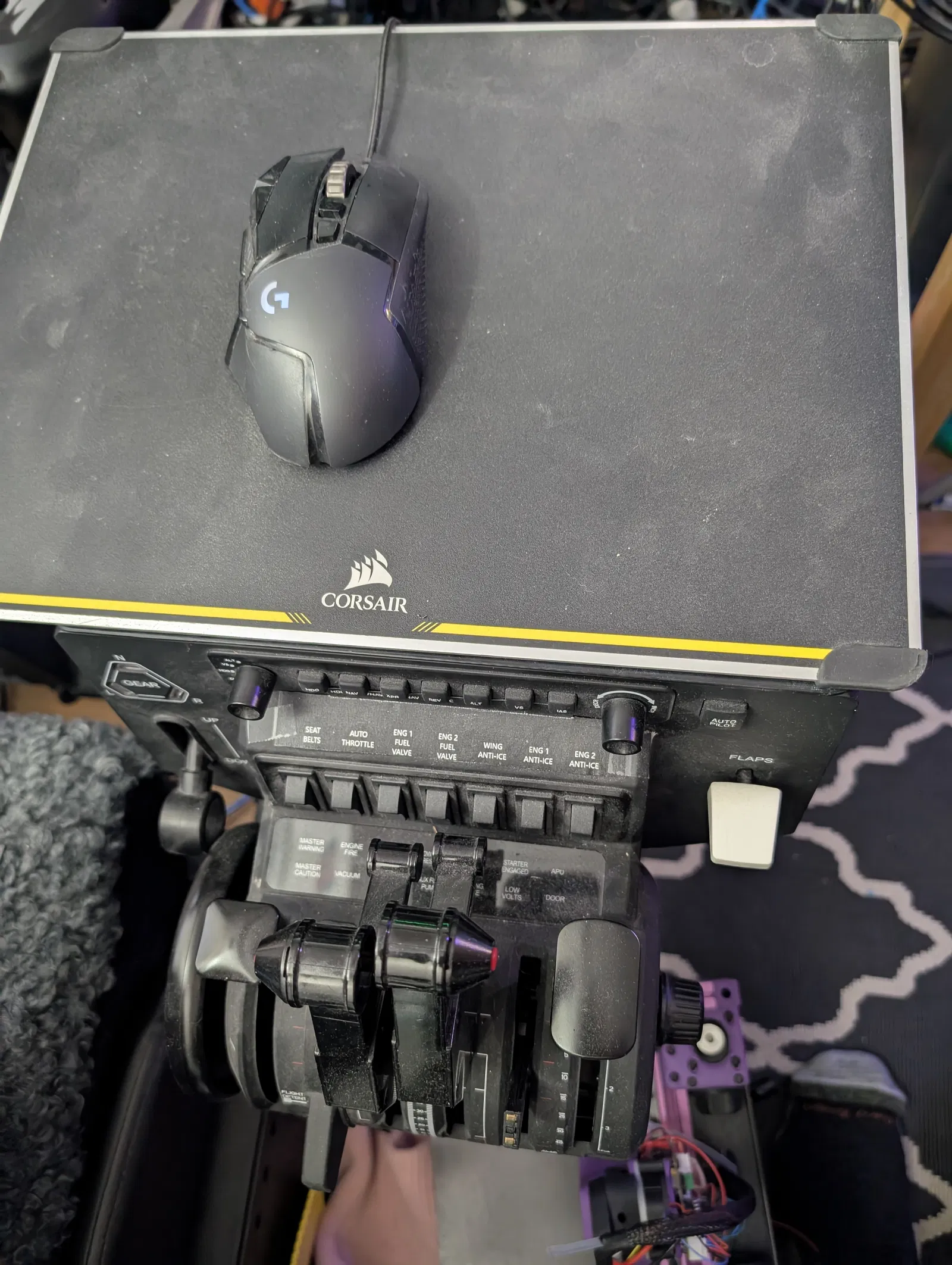 Mình có cockpit, nhưng lại không có chỗ nào để dùng chuột cho ổn định. Vậy nên mình tận dụng các con ốc bắt trên mặt trên của Honeycomb Bravo để làm món này và đem đi in. Mình chọn dán băng keo 2 mặt một miếng mouse pad cứng lên trên (vì sẵn có), nhưng không dán thì cũng dùng ổn.