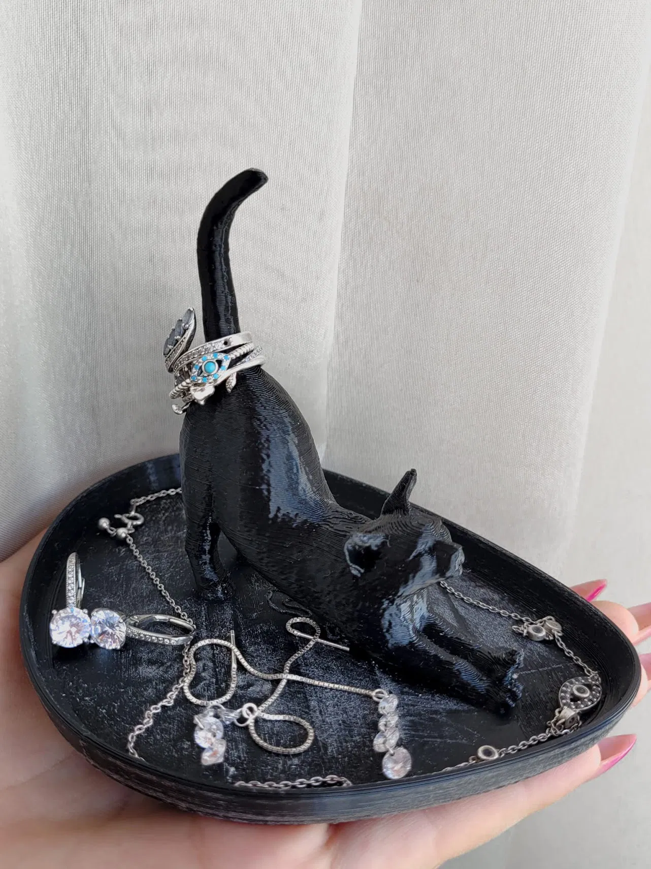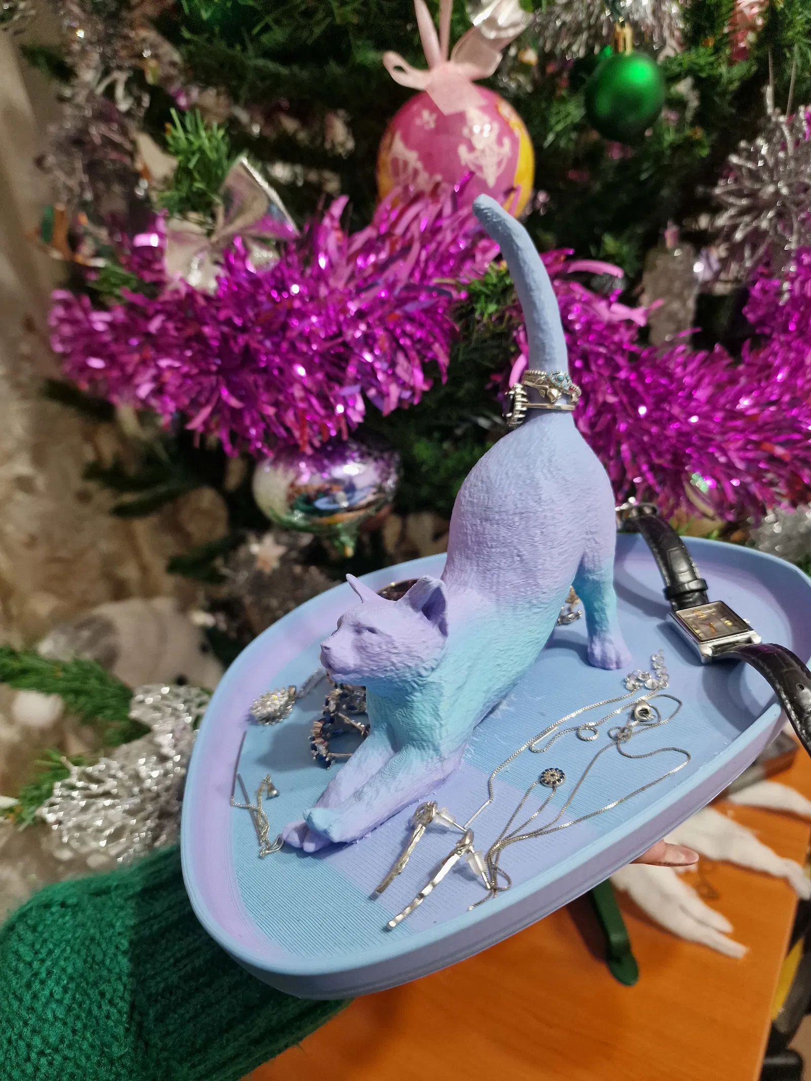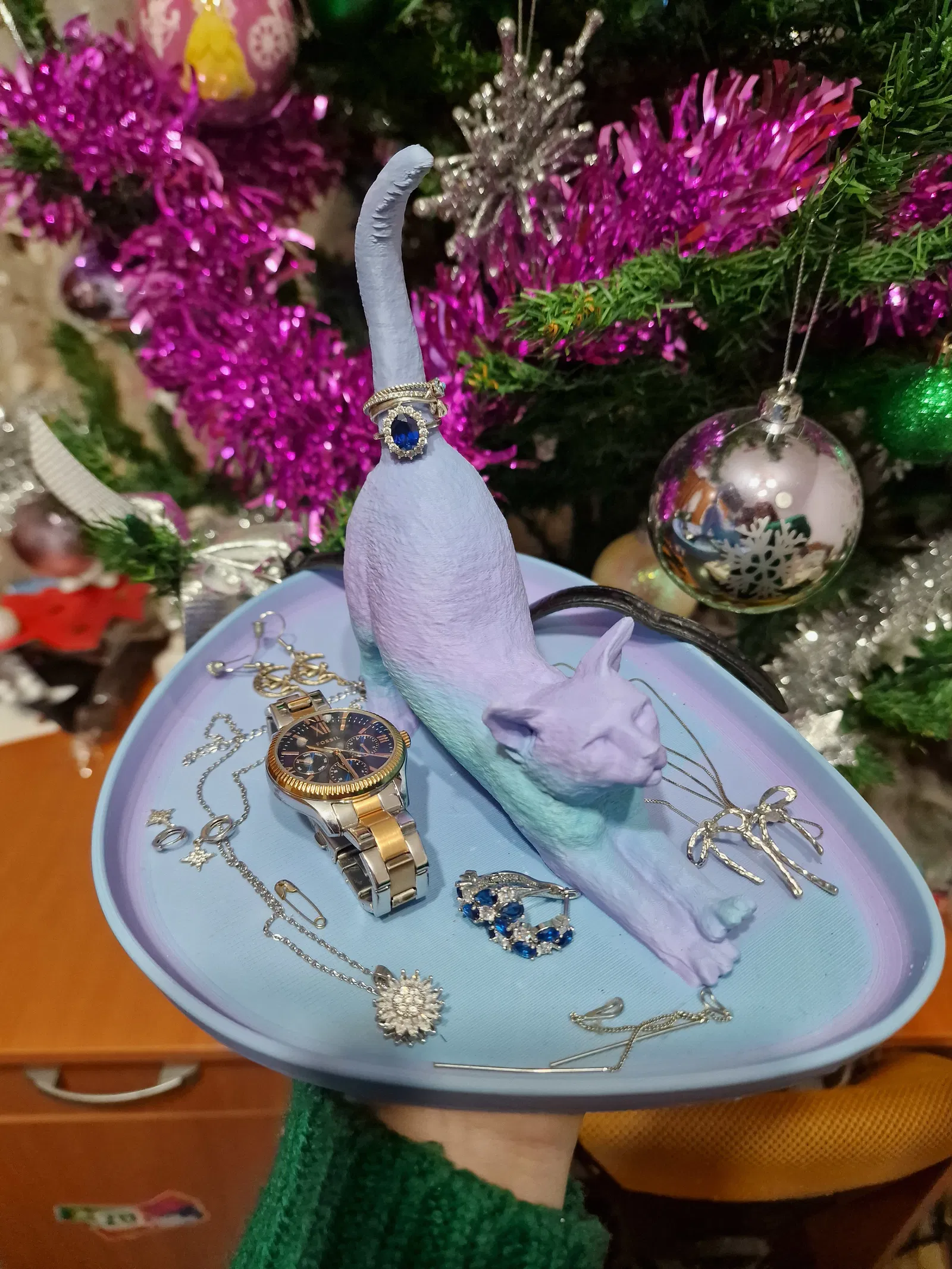 Remix từ 2 model để tạo kệ để nhẫn hình mèo kèm khay, làm quà tặng bạn gái. Có thể để nhẫn, dây chuyền, đồng hồ, kính (nếu scale up). Gợi ý in: 0.2mm, 2 walls, Cura; có thể cần supports.