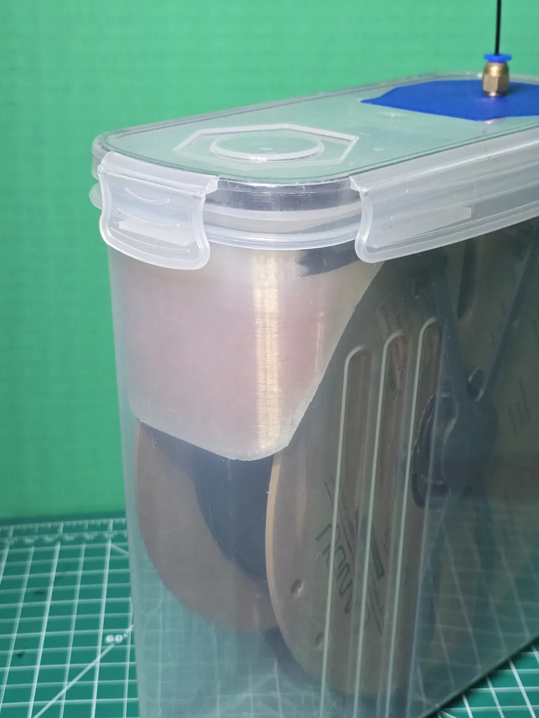 Mình làm bản cập nhật với chốt gài tốt hơn. Mèo nhà mình hay có thói quen hất đồ rớt (và còn nhảy từ giường tầng sang nóc cái enclosure của mình nữa), mà kiểu chốt cũ thì không ổn lắm nếu drybox bị rơi từ độ cao vài feet.