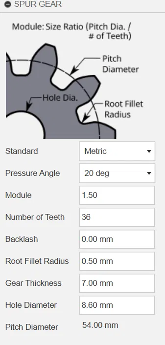 Bộ này gồm 3 bánh răng với kích thước khác nhau, được thiết kế để ăn khớp mượt với nhau. Lần lượt các bánh răng có 24, 36 và 48 răng, giúp linh hoạt trong nhiều cấu hình cơ khí. Bánh răng được thiết kế với module 1.5, thông số này xác định mối quan hệ tỷ lệ giữa đường kính vòng chia (pitch diameter) và kích thước răng. Độ dày mỗi bánh răng là 7 mm, cho độ bền chắc để dùng trong nhiều ứng dụng khác nhau. Ngoài ra, mỗi bánh răng có lỗ tâm đường kính 8.6 mm, giúp dễ dàng lắp lên trục hoặc các bộ phận liên quan. Với các thông số này, bộ bánh răng phù hợp cho nhiều hệ thống cơ khí, đảm bảo truyền lực hiệu quả và kiểm soát chuyển động chính xác.