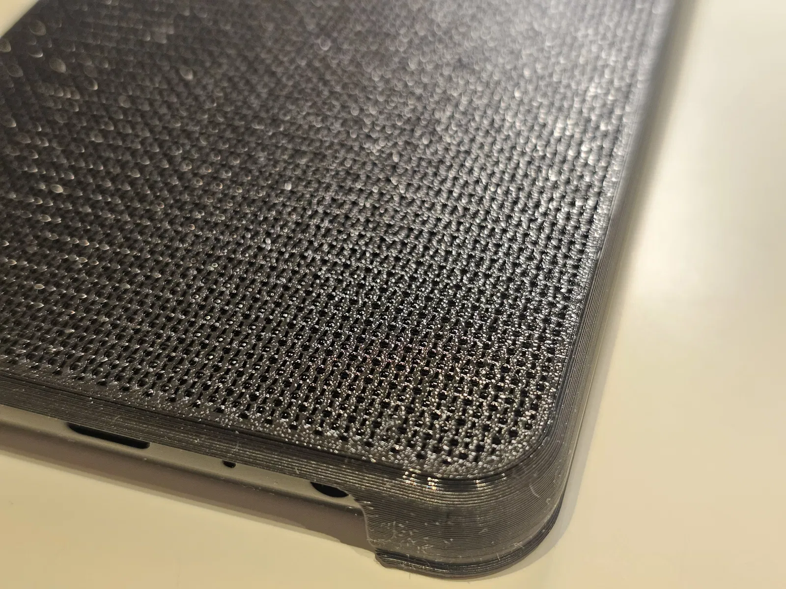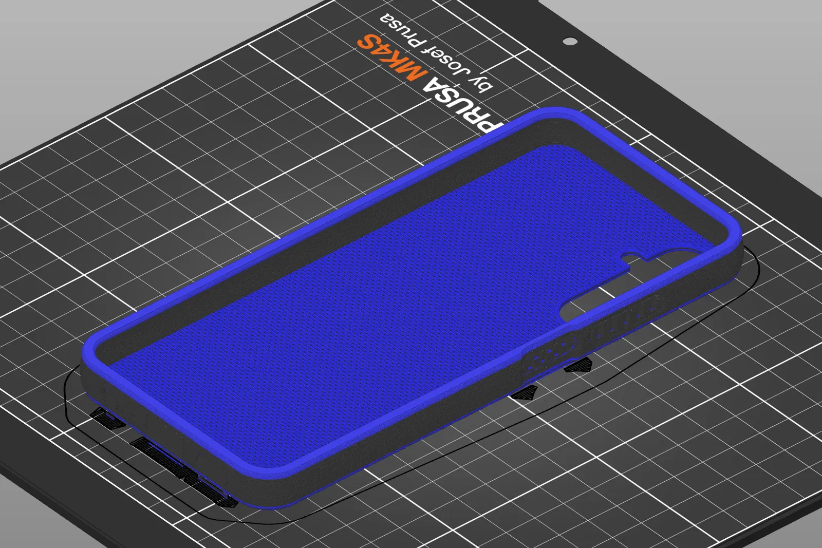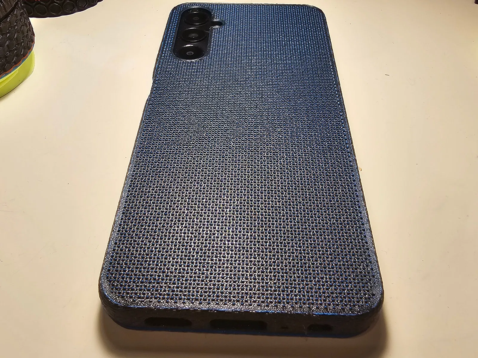 Mẫu ốp lưng Samsung Galaxy A05s với họa tiết honeycomb 3D đẹp khi in infill 40% tạo cảm giác như vải. Có bản TPU che cổng dưới và bản PETG thoáng hơn, dễ tháo hơn; lưu ý độ dài khe nút bên hông.
