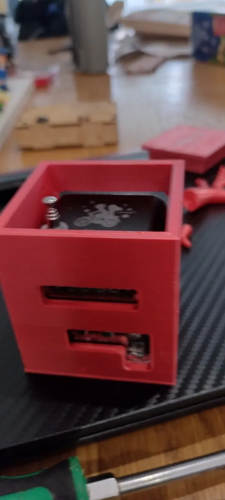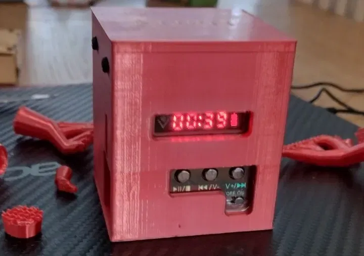 Máy nghe nhạc TD-V26 là một máy nghe nhạc mp3 đa chức năng nhỏ gọn và kết hợp radio. Nút chế độ của nó cho phép truy cập thẻ SD, radio, bluetooth và ổ nhớ. Điều này thì ổn cho những đứa trẻ lớn hơn nhưng quá phức tạp cho trẻ nhỏ hoặc những người có khả năng bị suy giảm. Chúng muốn một thiết bị đơn giản không cần điều chỉnh, không có radio và một máy phát cho những bài hát hoặc câu chuyện yêu thích của chúng được lưu trên thẻ nhớ mà không bị rơi ra. Chúng không cần truy cập vào một ăng-ten có thể bị gãy. Thiết kế của tôi cho phép điều này và nó được nhắm đến cháu trai tự kỷ của tôi, người rất thích âm nhạc nhưng hiện tại muốn một máy phát đơn giản hơn. Công tắc chế độ vẫn có thể truy cập nhưng được giấu đi và ăng-ten được che phủ. Tôi cũng đã cá nhân hóa nắp với tên của cháu nhưng tôi cũng đã bao gồm một cái đơn giản. Vì vậy, nếu bạn muốn một giải pháp đơn giản phù hợp với nhu cầu của con bạn, hãy thử nghiệm. Đơn vị này có giá khoảng 12 bảng Anh trên Amazon hoặc thậm chí rẻ hơn từ Trung Quốc. Tìm kiếm hướng dẫn sử dụng trực tuyến cho tất cả các chức năng. Nắp được giữ bằng 4 vít tự khoan nhỏ.