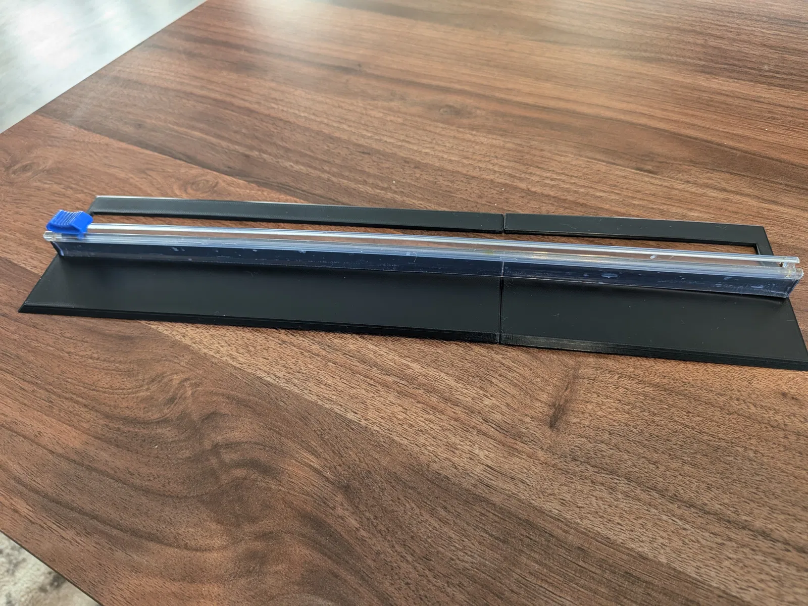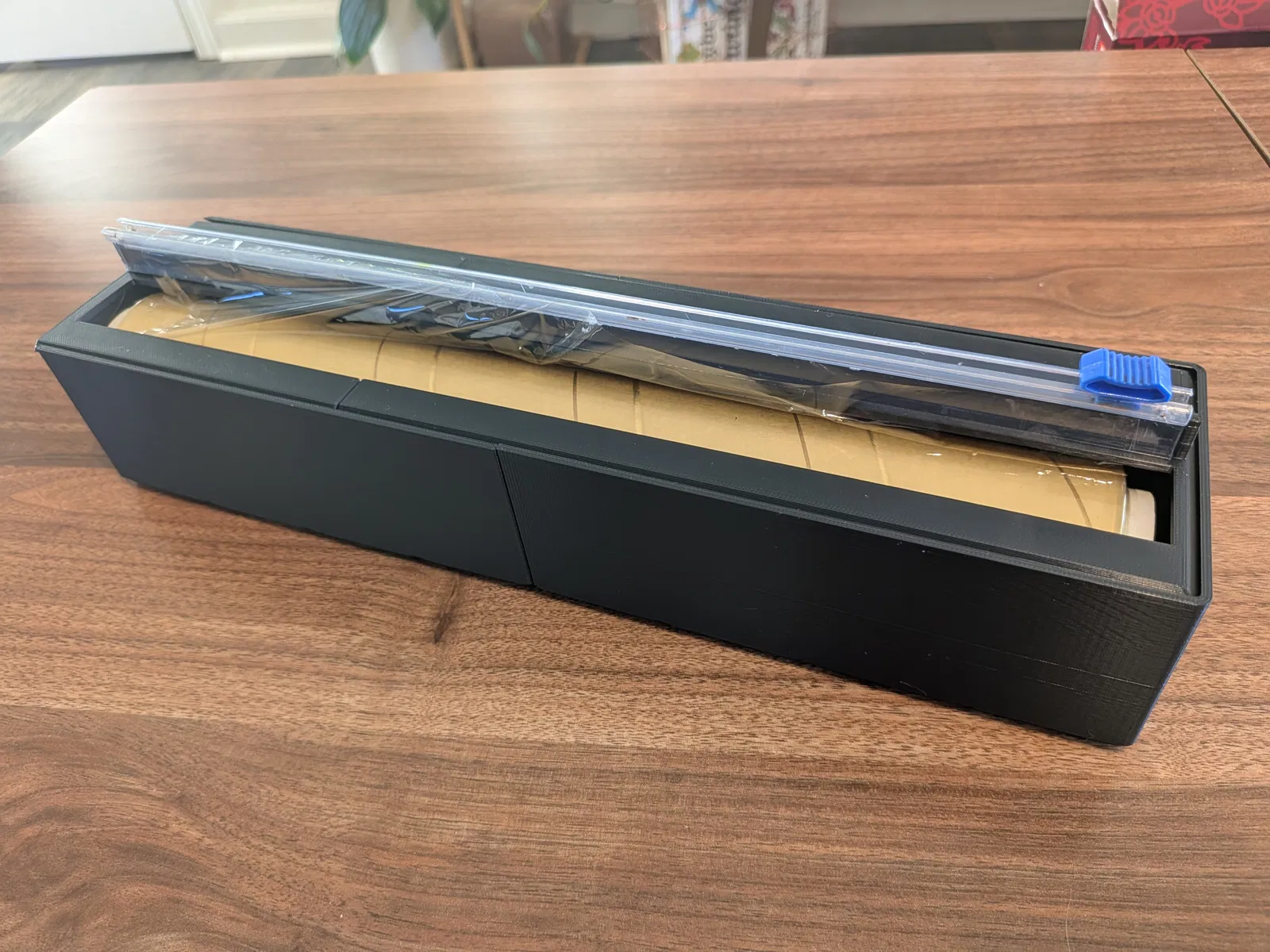 Thiết kế gốc họ gắn một lưỡi cắt dán keo mua trên Amazon. Mình thì có sẵn vài cái cutter từ hộp plastic wrap Costco (mấy hộp cũ bị bung/rách), nên remix lại để có một thanh/gờ cho cutter gài vào. Hai đầu có phần nhô lớn hơn chút để giữ cutter nằm đúng vị trí, hạn chế bị xê dịch.