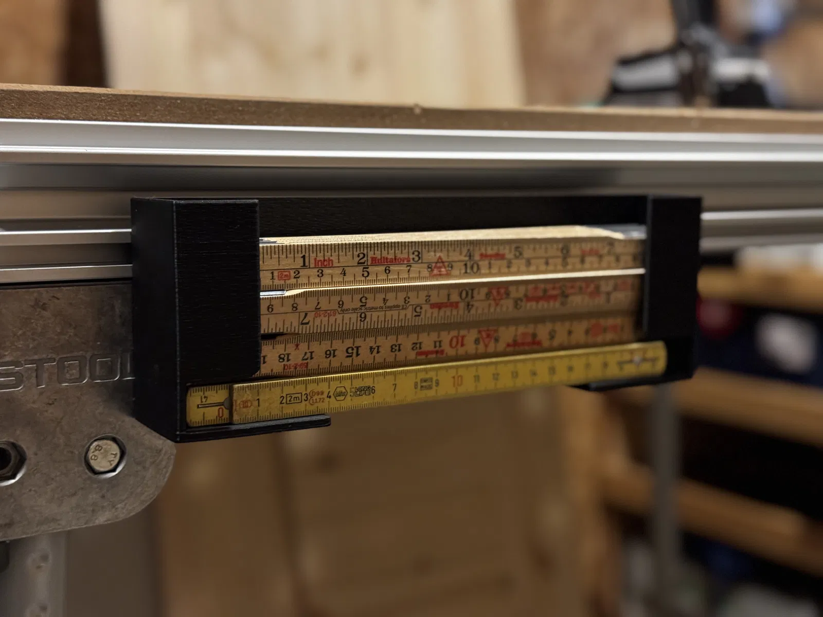 Giá/ống nhả thước gấp chứa khoảng 5 thước 2m, hỗ trợ nhiều kiểu lắp: bắt tường, Festool MFT-3 T-slot, french cleat và IKEA Skadis. Khuyến nghị dùng vít máy M4 (10mm) cho các adapter.