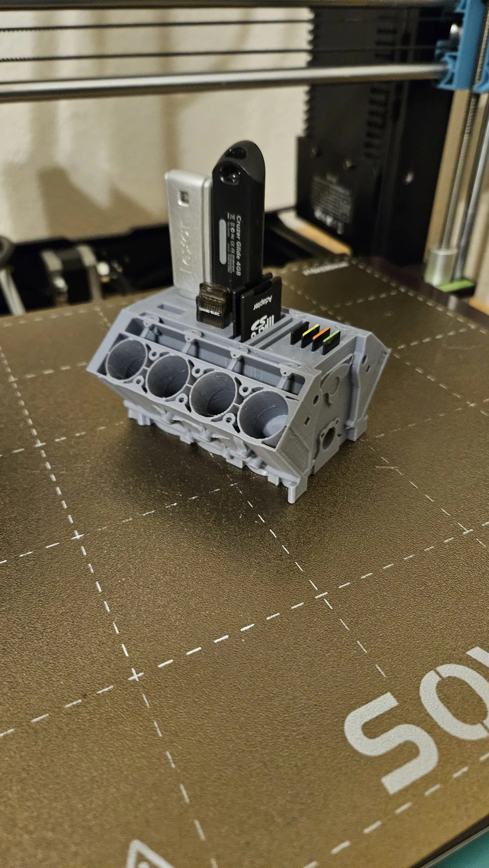 Mẫu engine block được chỉnh sửa từ bản kẹp danh thiếp ZR1 để đựng thẻ SD và USB thumb drive. In 3D không cần supports. Kèm thêm file STL cho phiên bản chỉ giữ thumb drive.