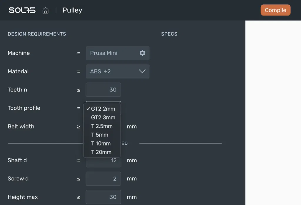 - Các tham số như số răng, bề rộng dây đai (belt width), đường kính trục (shaft) và ốc/vít (screw), và nhiều thứ khác...