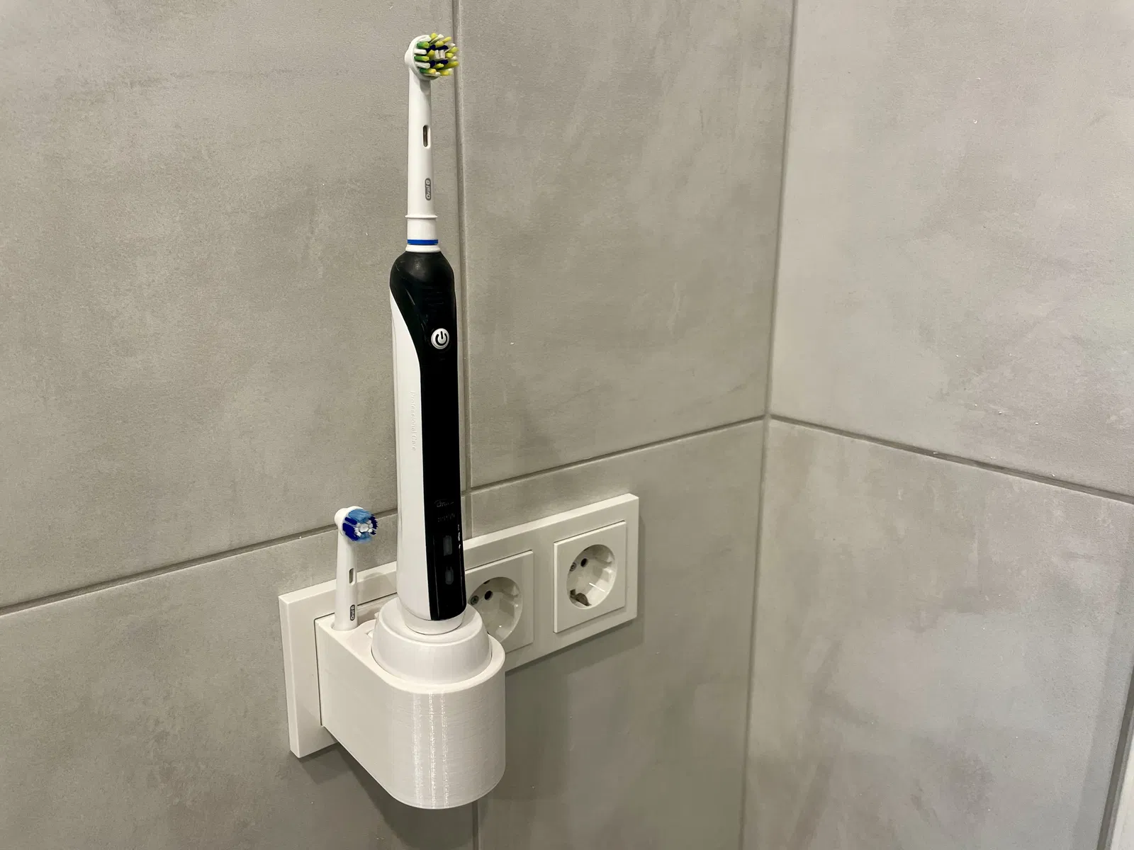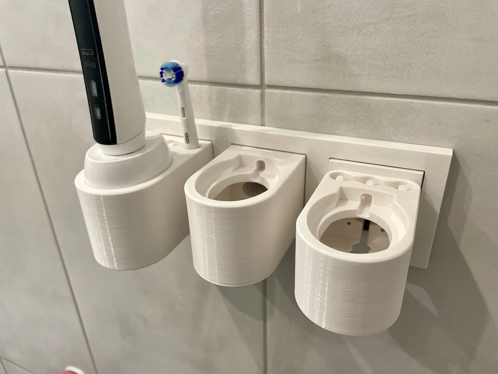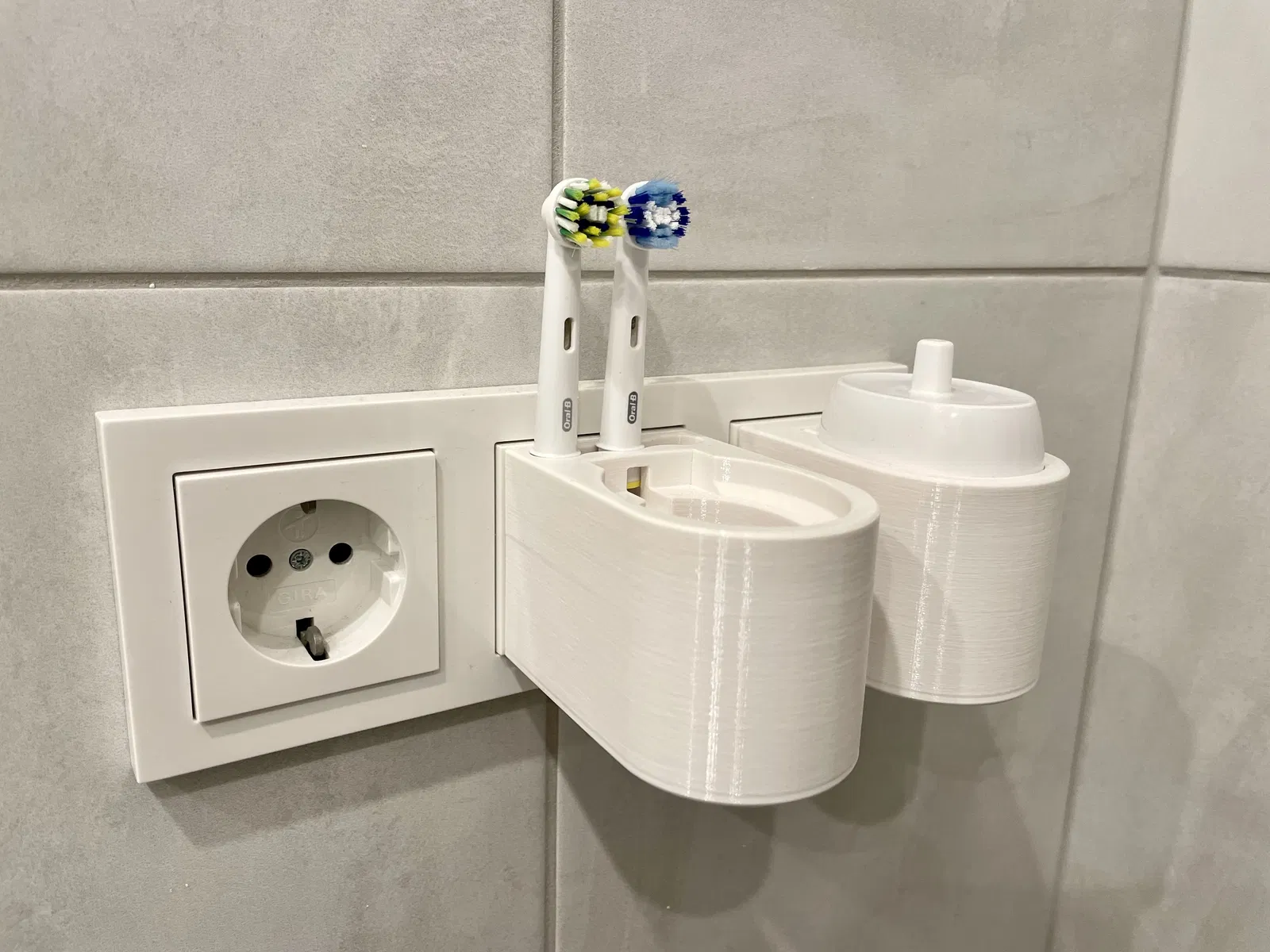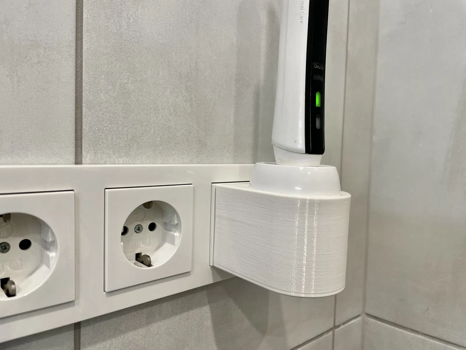 Thiết kế giá treo gắn ổ cắm giúp giấu gọn “mớ dây” của bàn chải điện Braun/Oral-B. Tương thích chuẩn ổ tường System 55 (có bản Short), có tuỳ chọn khay giữ đầu bàn chải, in PETG/ABS.