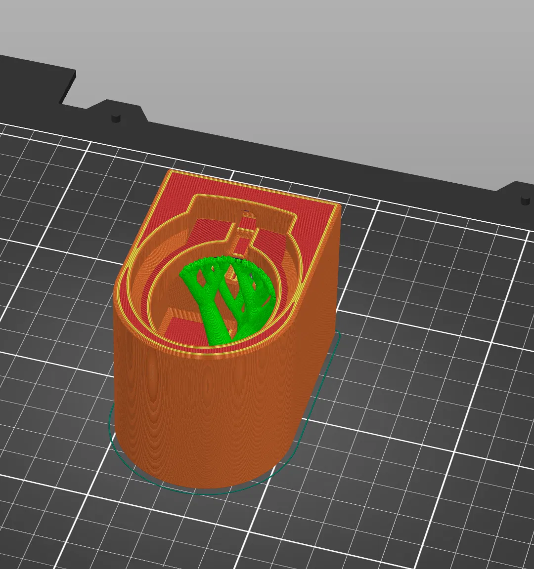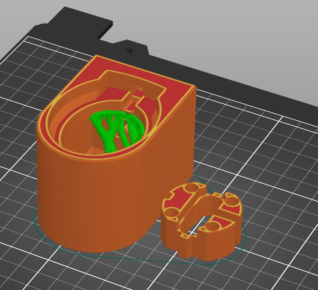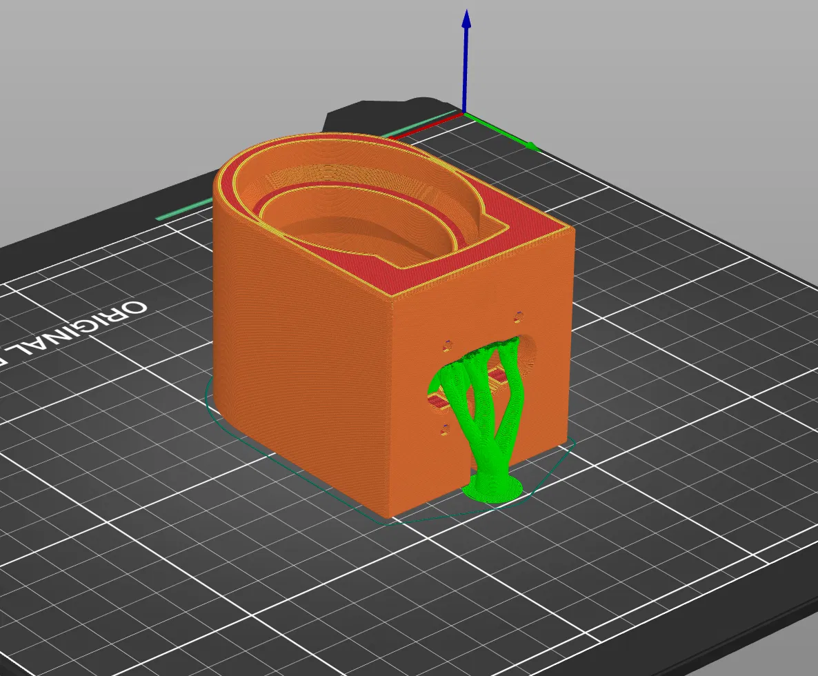 Nên in các phần bằng PETG hoặc ABS. Mình có kèm hình hướng đặt chi tiết và phần support chọn lọc để bạn dễ in. Dùng organic support với PrusaSlicer 2.6 mới sẽ tiết kiệm khá nhiều filament và gỡ support cũng dễ hơn. Dùng 3 perimeters và 15–20% infill. Lưu ý phần phích cắm có vài chỗ rất mỏng, nhưng khi bắt vít vào phần thân đế rồi thì sẽ không bị gãy.