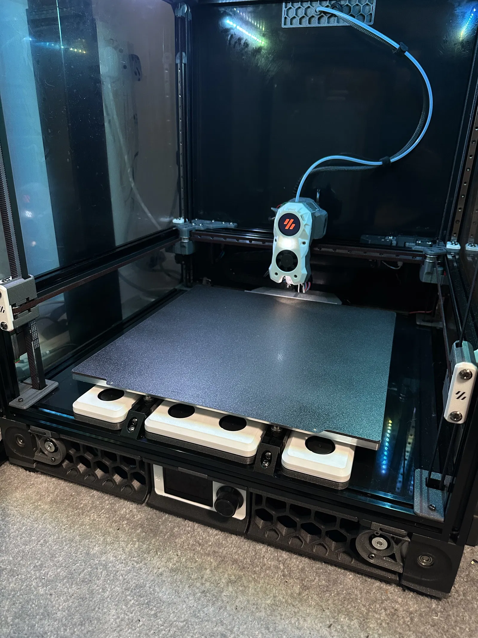 Hai cái theo thiết kế gốc mình in ra thì không vừa đặt sát nhau ở khoảng trống giữa các thanh đỡ bed của Voron V2.4 350mm, nên mình gộp bản Left và Right lại thành một module 2 quạt (dual fan) để vừa đúng không gian rộng 130mm.