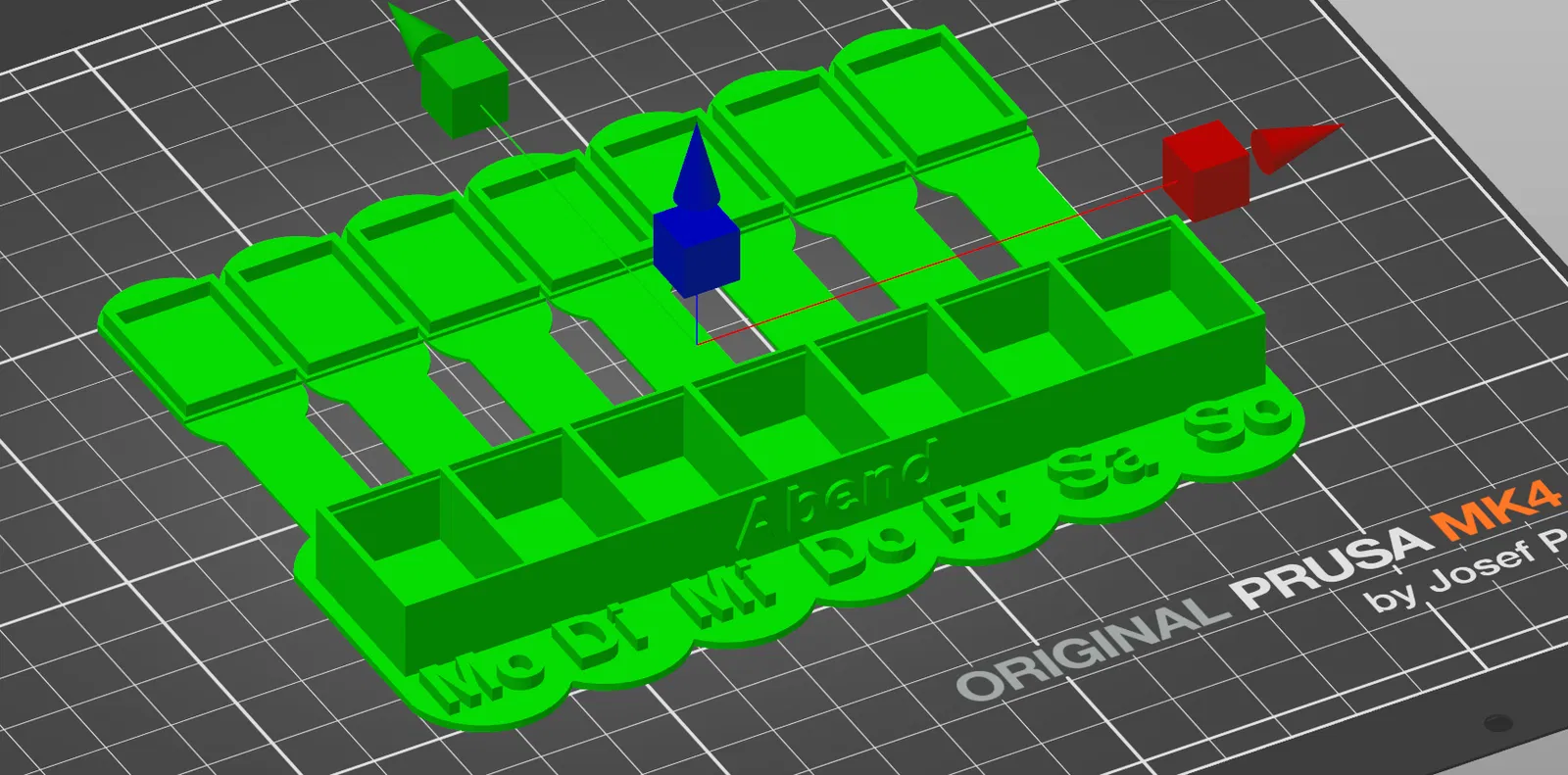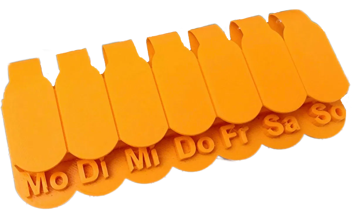 Hộp thuốc dùng cho cả tuần với tên các ngày trong tuần bằng tiếng Đức. In bằng PETG, Infill 50% và chiều cao lớp 0,15 mm. Có thêm file STL cho ngăn “Abend”, chữ ngày trong tuần được hạ thấp hơn.