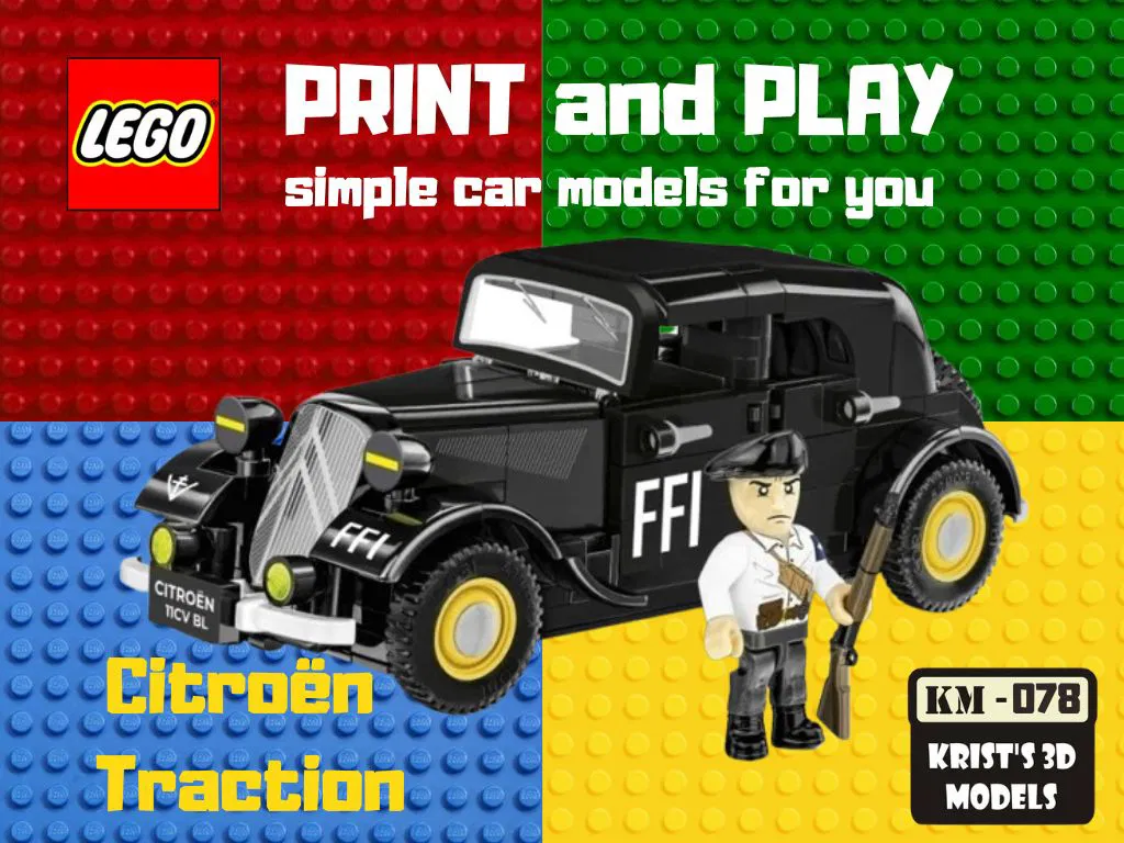 Chiếc xe Citroën Traction này, với thiết kế mô phỏng lại form dáng cổ điển của những năm 1930, chắc chắn sẽ làm hài lòng cả những người chơi khó tính nhất. Bạn có thể dễ dàng in mô hình này ra và biến nó thành một phần của bộ sưu tập LEGO, hoặc tự tạo ra một thế giới mini đầy màu sắc. Việc lắp ráp vô cùng đơn giản, chỉ cần thêm 2 trục LEGO là xe đã có thể lăn bánh, sẵn sàng cho mọi cuộc phiêu lưu mà trí tưởng tượng của bạn vẽ ra. Phù hợp cho cả trẻ em và người lớn yêu thích xe cổ và LEGO.