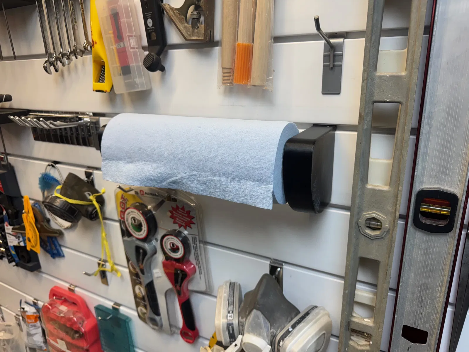 Với thiết kế thông minh, chiếc giá này không chỉ giữ chắc chắn cuộn giấy mà còn giúp bạn tiết kiệm không gian đáng kể. Thay vì để giấy lung tung, giờ đây bạn có thể treo nó ngay trên tường cùng với các dụng cụ khác, tạo nên một khu vực làm việc khoa học và ngăn nắp. Sản phẩm rất dễ lắp đặt và sử dụng, chỉ cần gắn hai phần của giá lên các rãnh của hệ thống slatwall là xong, không cần thêm dụng cụ phức tạp.
